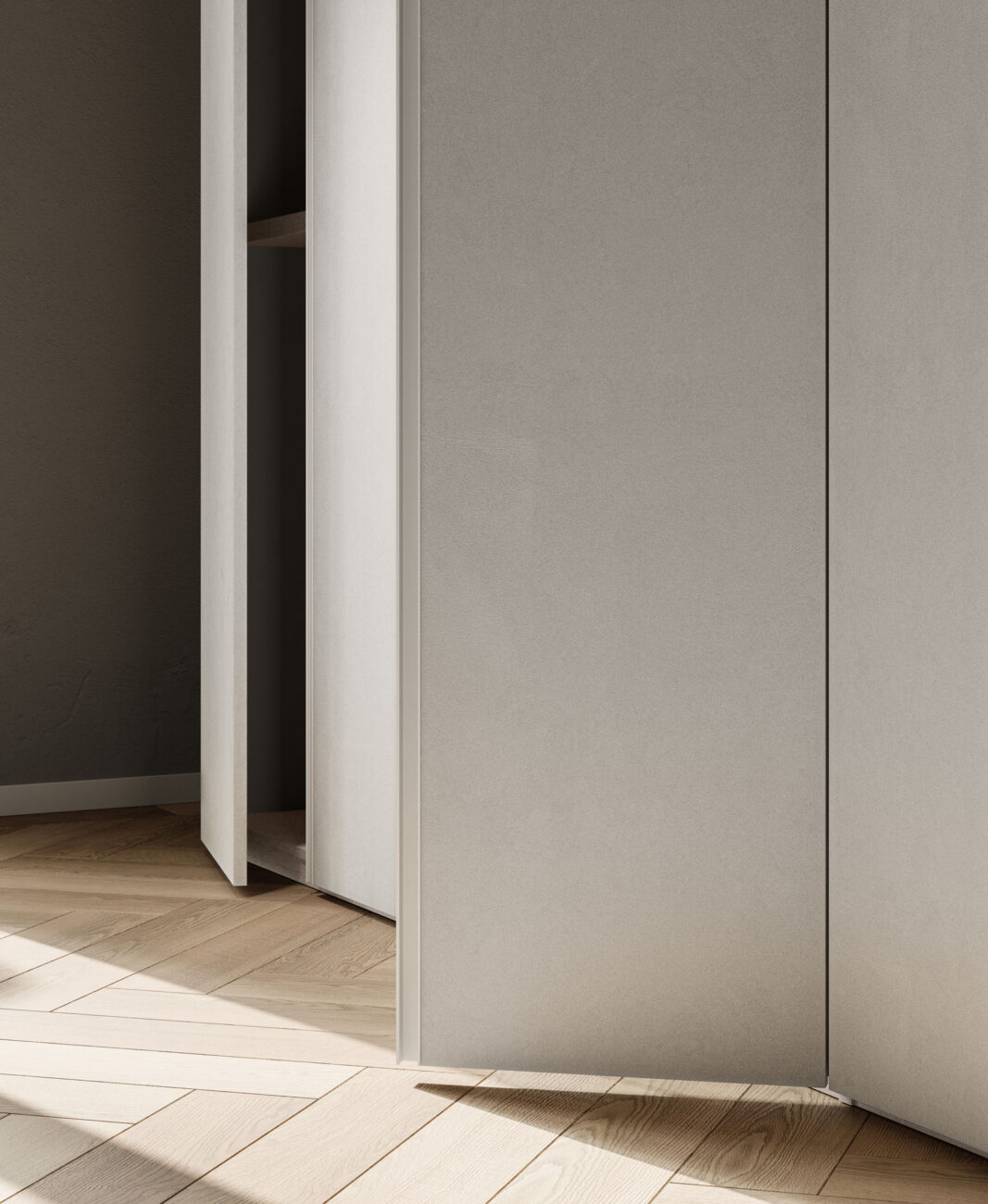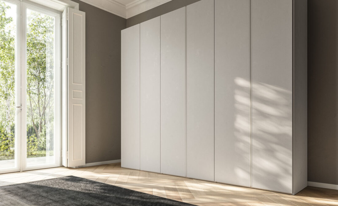 Tratto hinged door wardrobe in Cemento Tropea finish. Structure in Cotone finish.