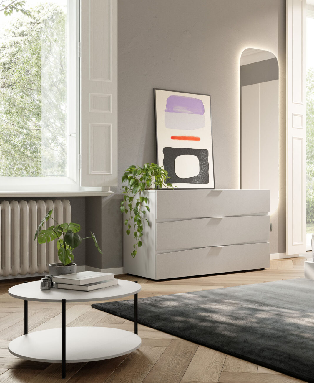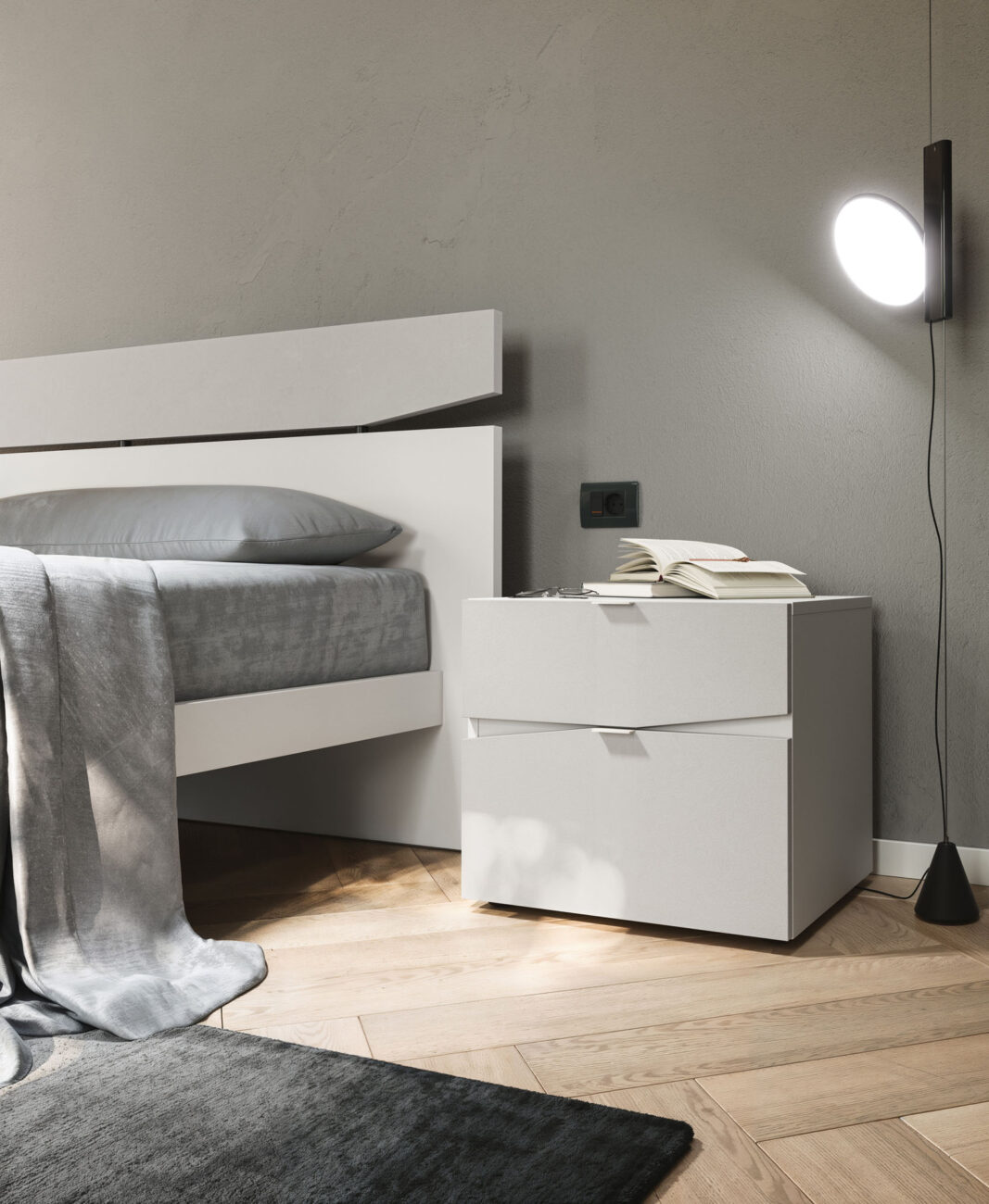 Contra bed with Alfa bed frame in Seta finish, upper panel in Cemento Tropea finish. Slant drawer units in Seta with fronts in Cemento Tropea finish. Soul 21 mirror.
