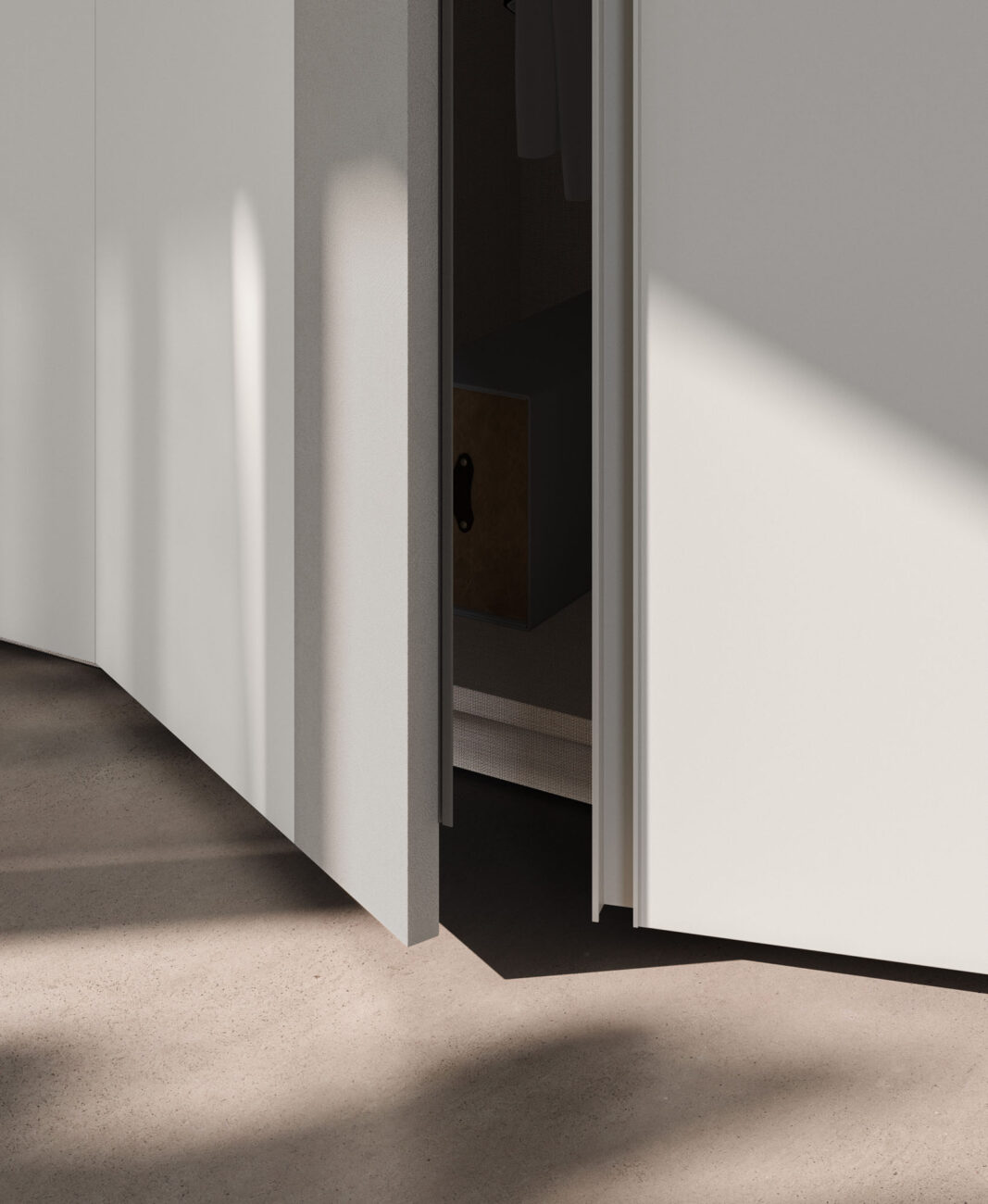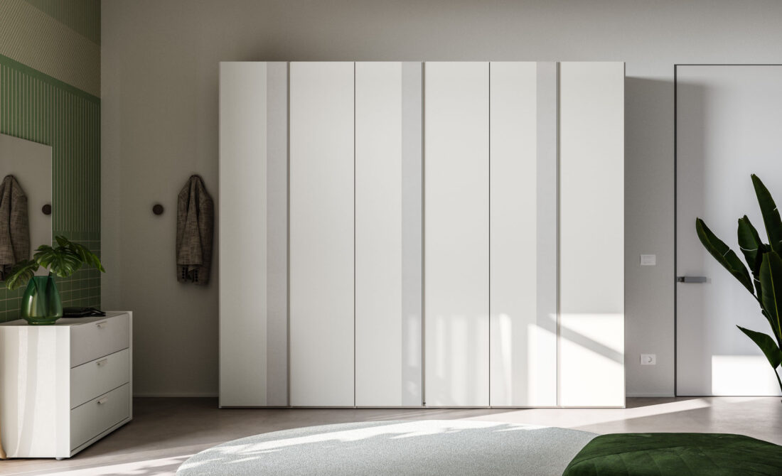 Terna hinged door wardrobe in Seta and Cemento Tropea finish. Structure in Cotone finish.