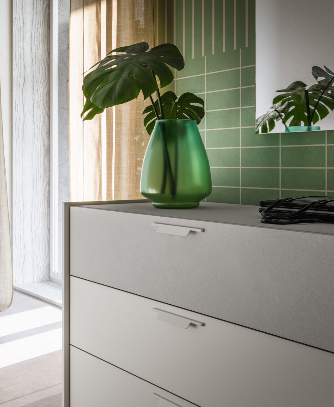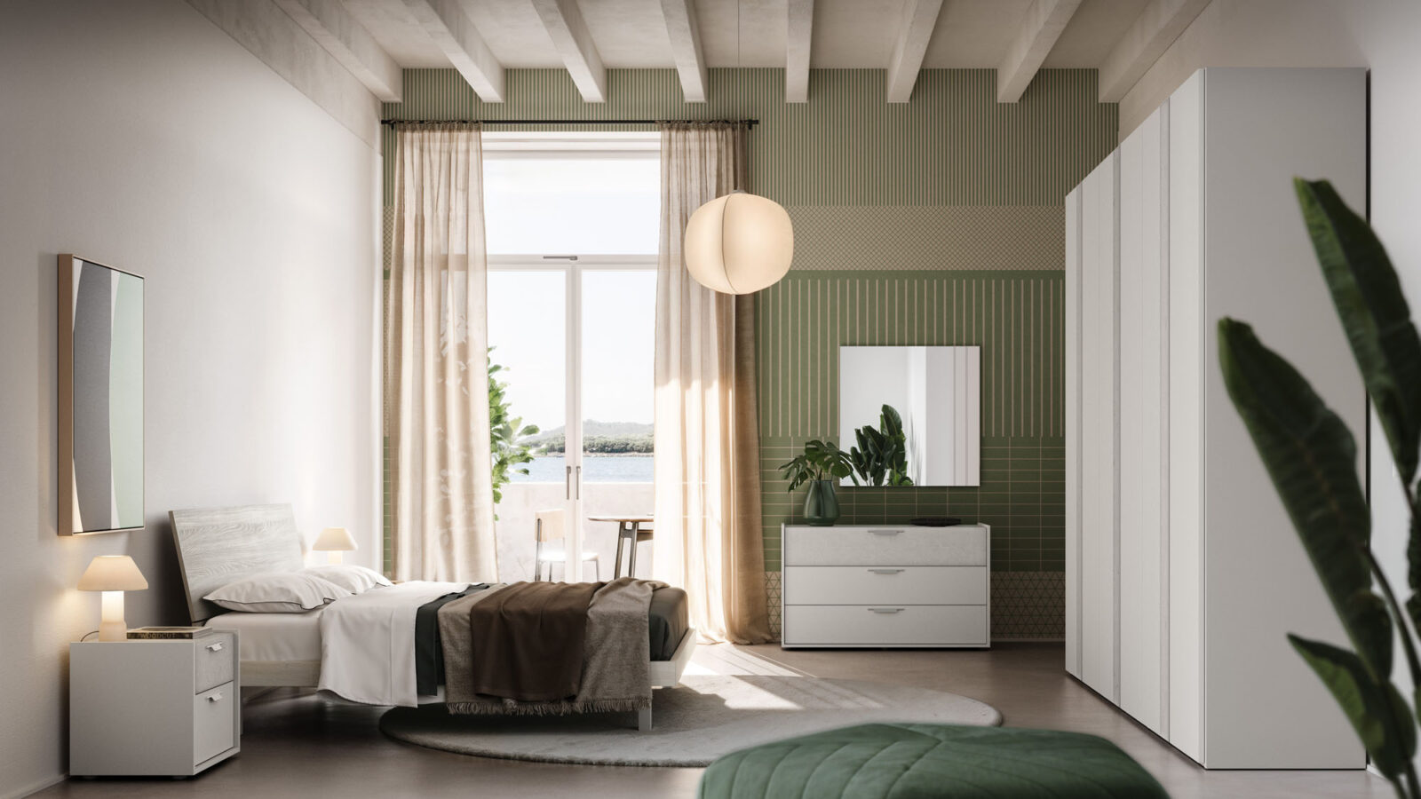 Patti drawer units in Seta and Cemento Tropea finish, Quadrato mirror. Terna hinged door wardrobe in Seta and Cemento Tropea finish.