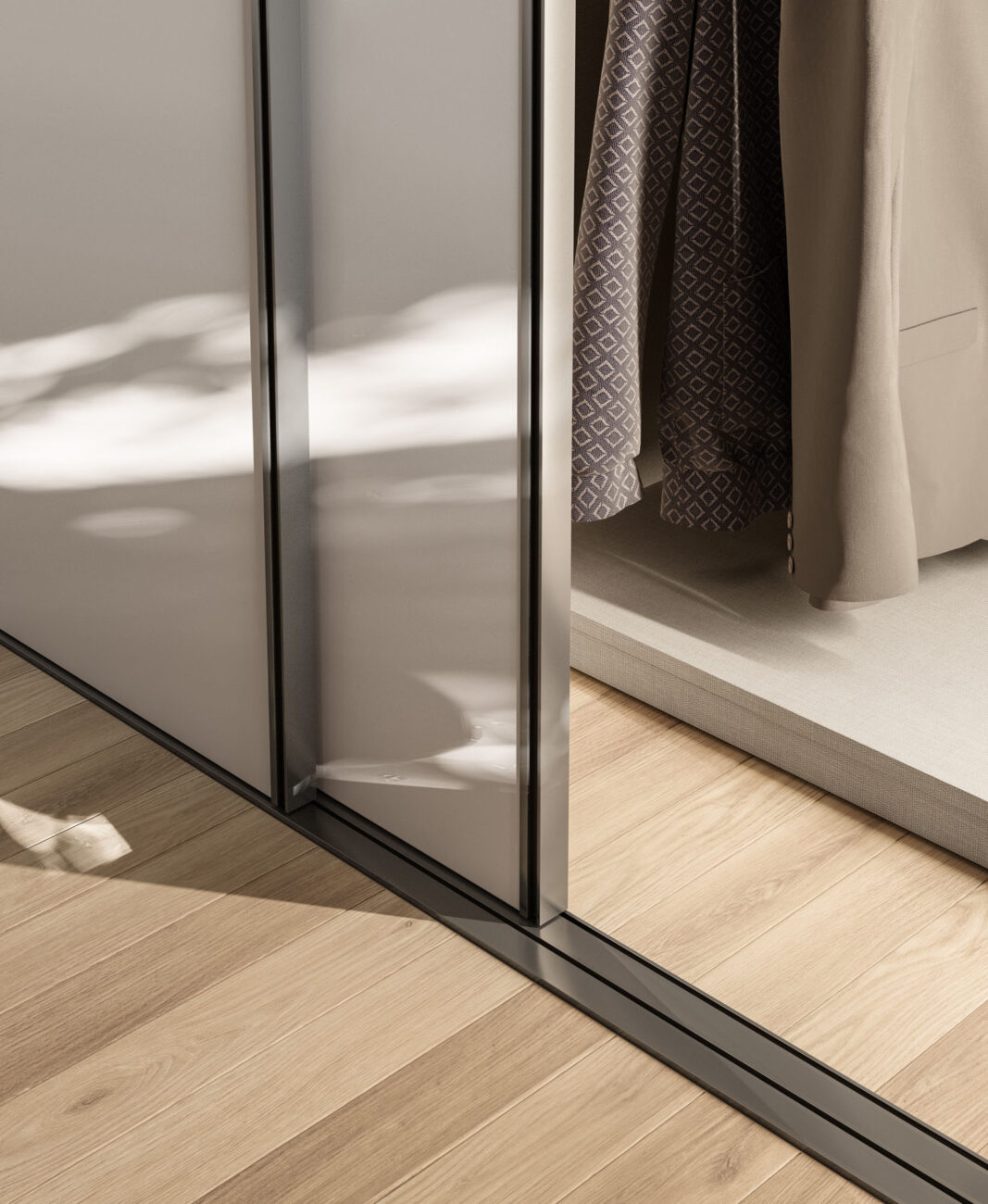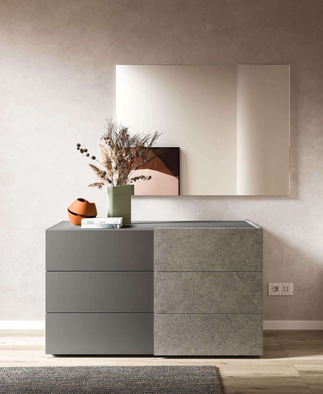 Double drawer units in Lavagna and Roccia bolsena finish, Rettangolare mirror. Basic portal in Velluto finish, wardrobe without doors in Cotone finish.