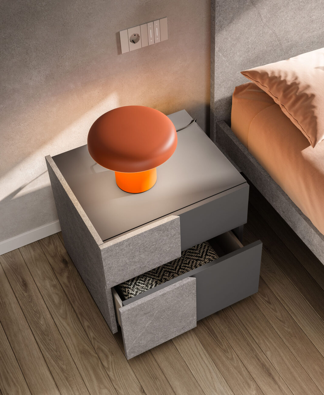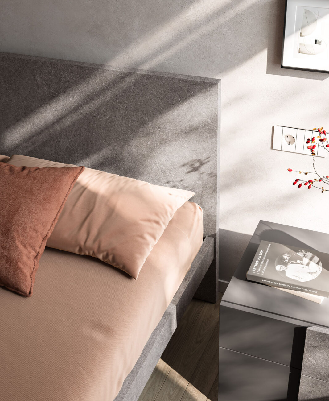 Cremi bed with Alfa bed frame in Roccia Bolsena finish. Double bedside table in Lavagna and Roccia bolsena finish.
