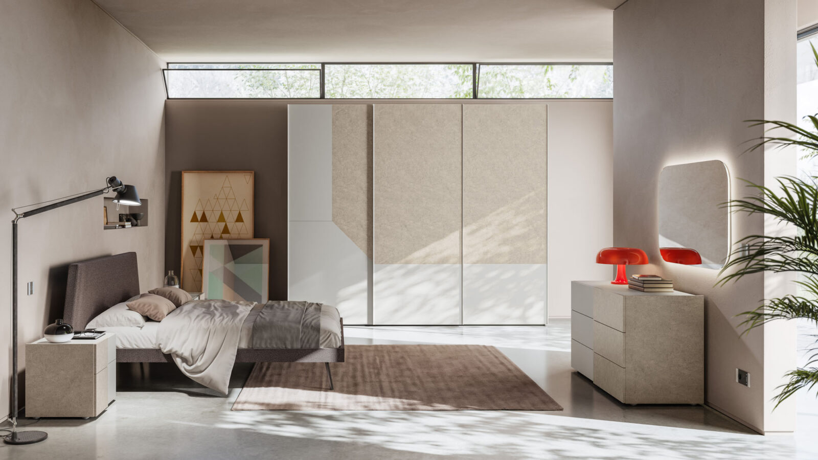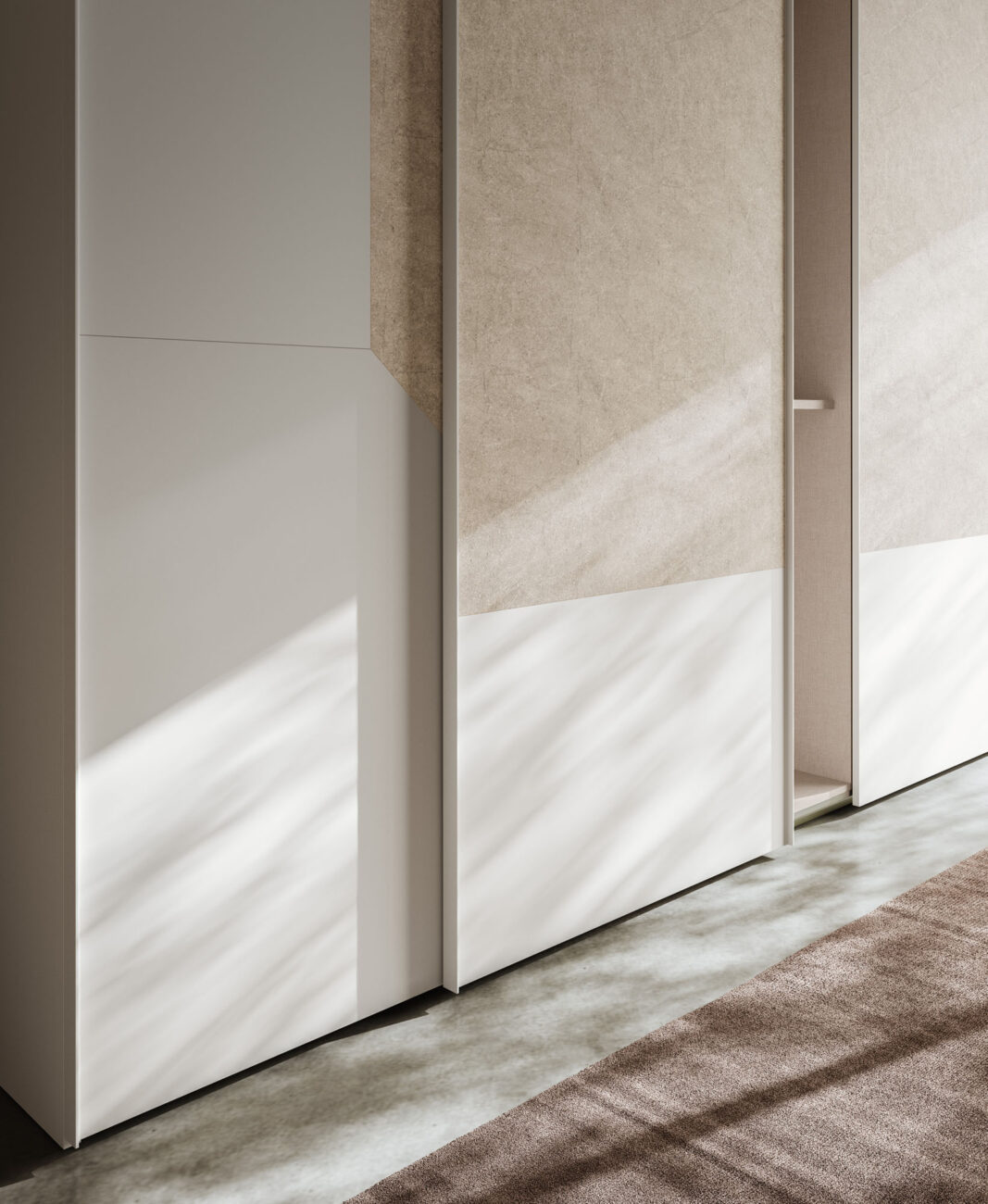 Climb DN and Level DN sliding door wardrobe in Seta and Roccia Piacenza finish. Structure in Cotone finish.