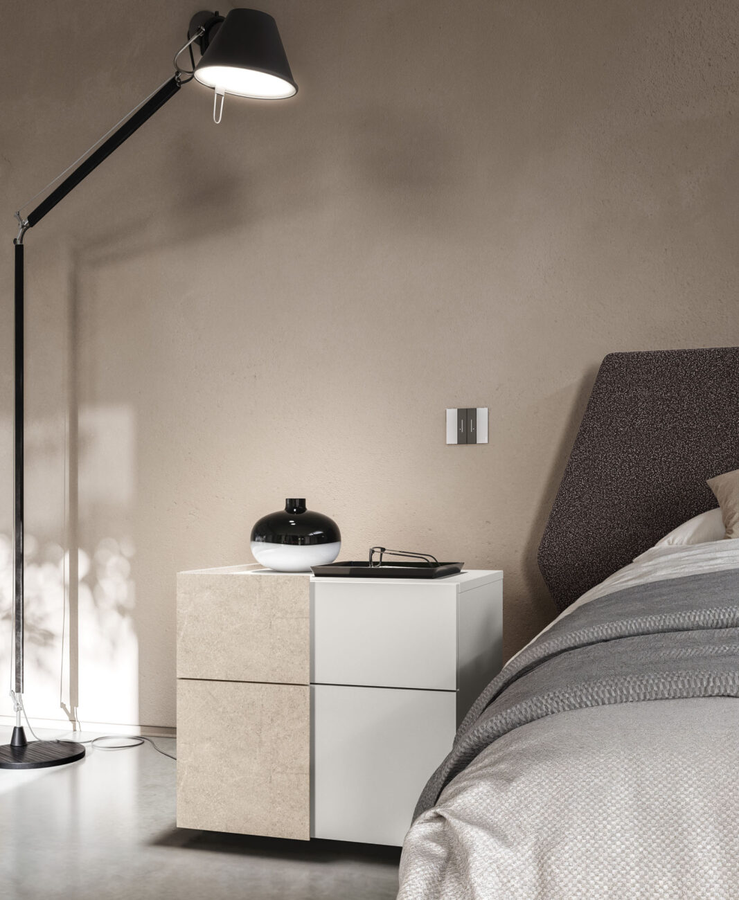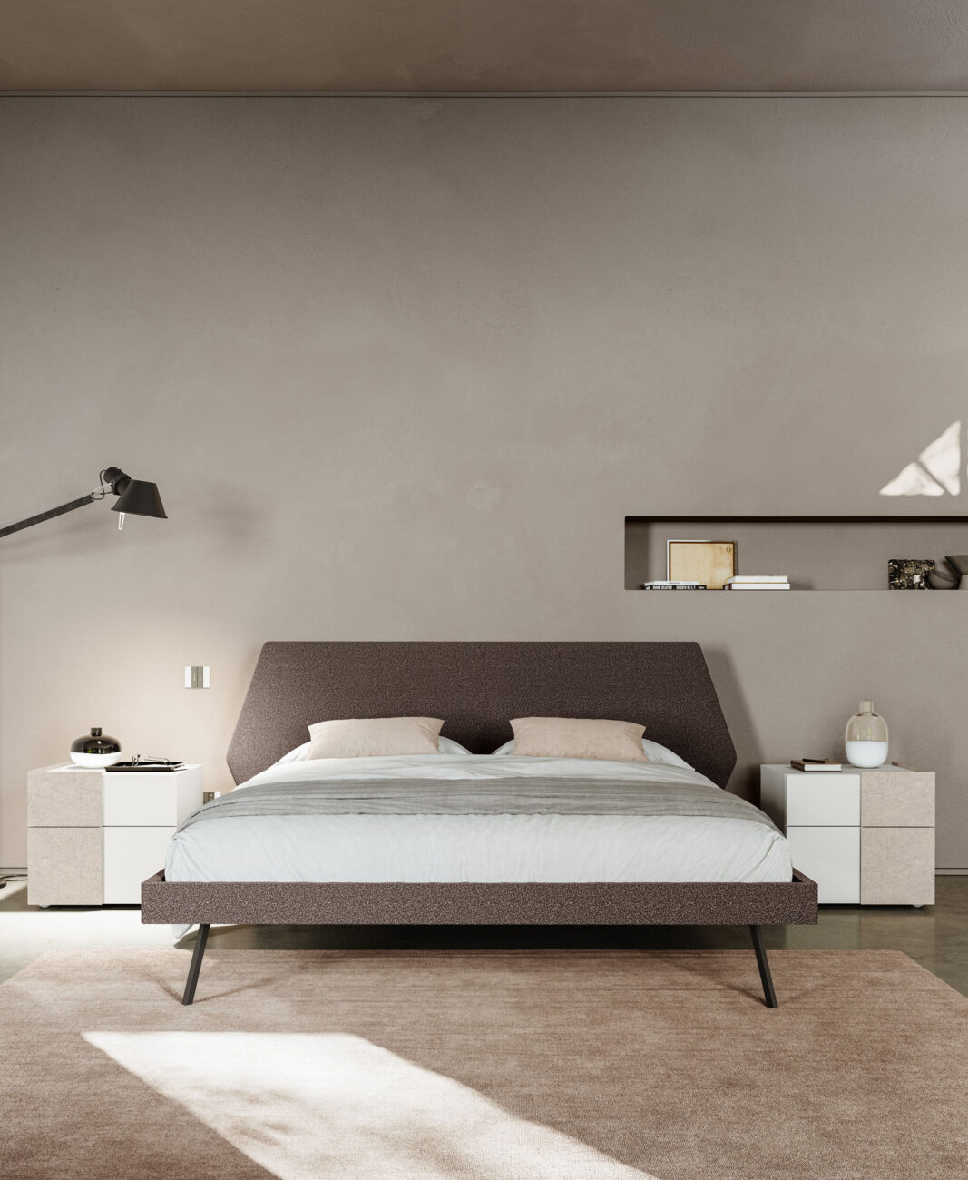 Esacto upholstered bed with Iota bed frame in Saturno SA13 fabric. Double drawer units in Seta and Roccia Piacenza finish, Soul 31 mirror.
