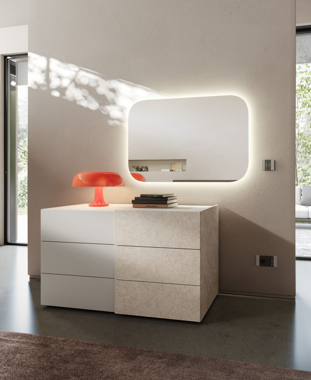 Double drawer units in Seta and Roccia Piacenza finish, Soul 31 mirror. Climb DN and Level DN sliding door wardrobe in Seta and Roccia Piacenza finish.