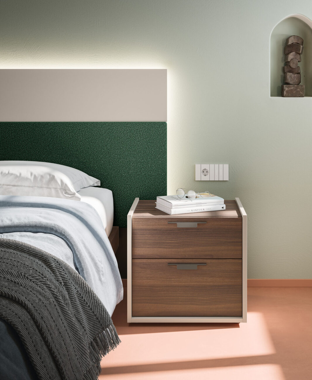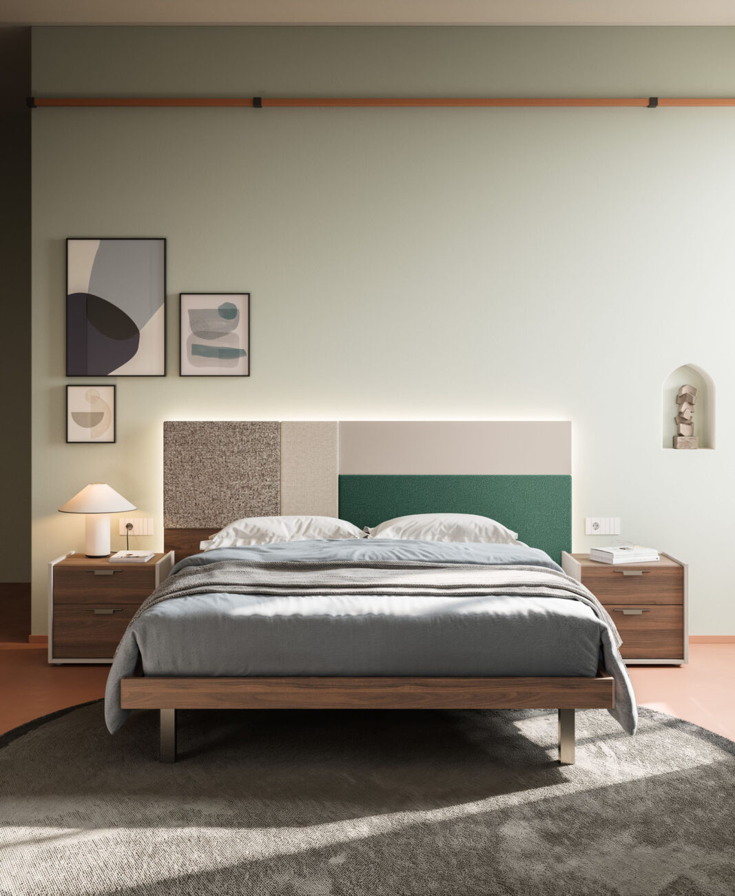 Giako Basic bed system in Tortora and Cotto finish, Clara CL03, Saturno SA15 and Dafne DA10 fabric, Alfa bed frame in Cotto.