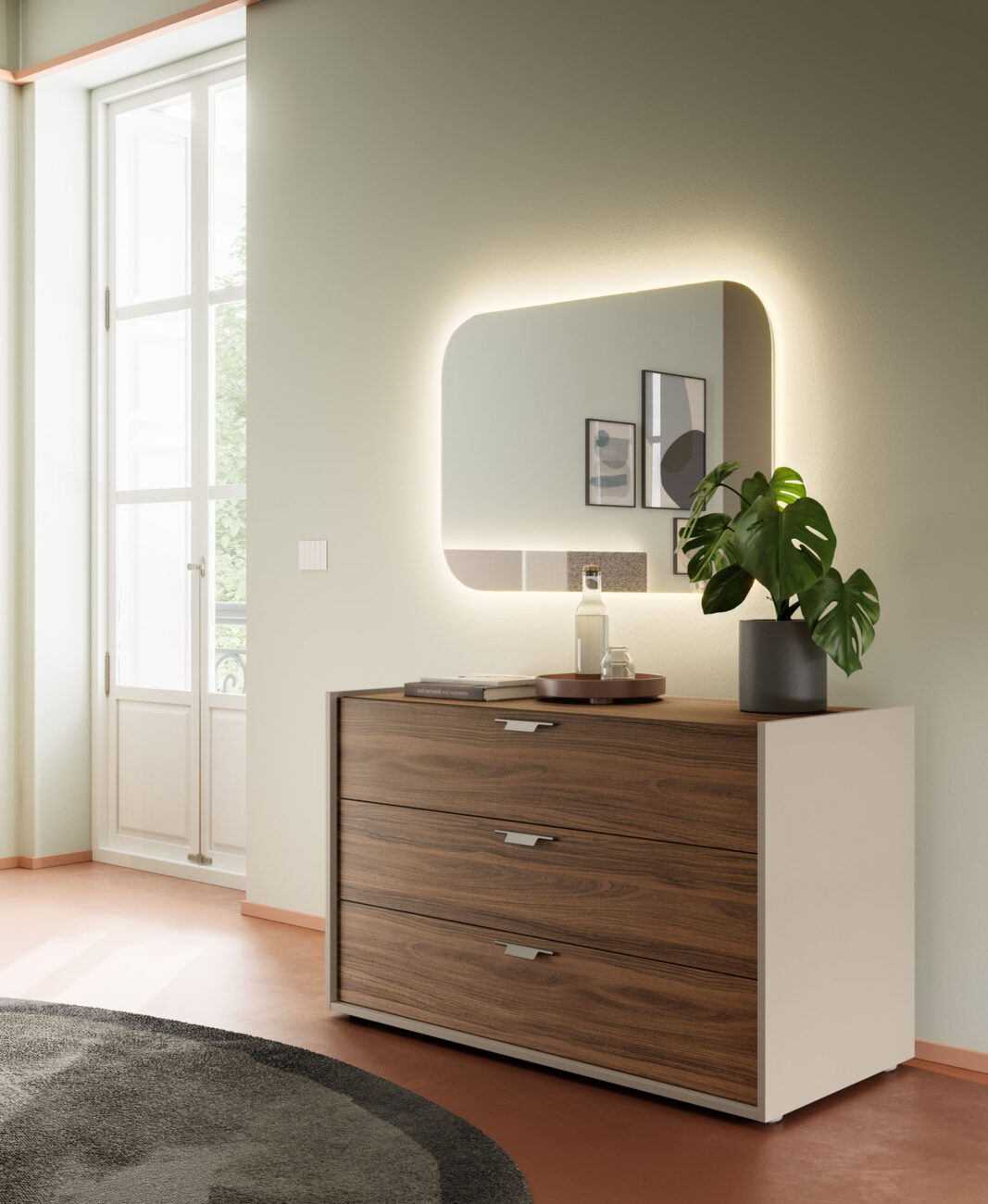 Patti drawer units in Tortora and Cotto finish with burnished handles, Soul 31 mirror. Visual hinged door wardrobe in Cotto e Tortora finish.