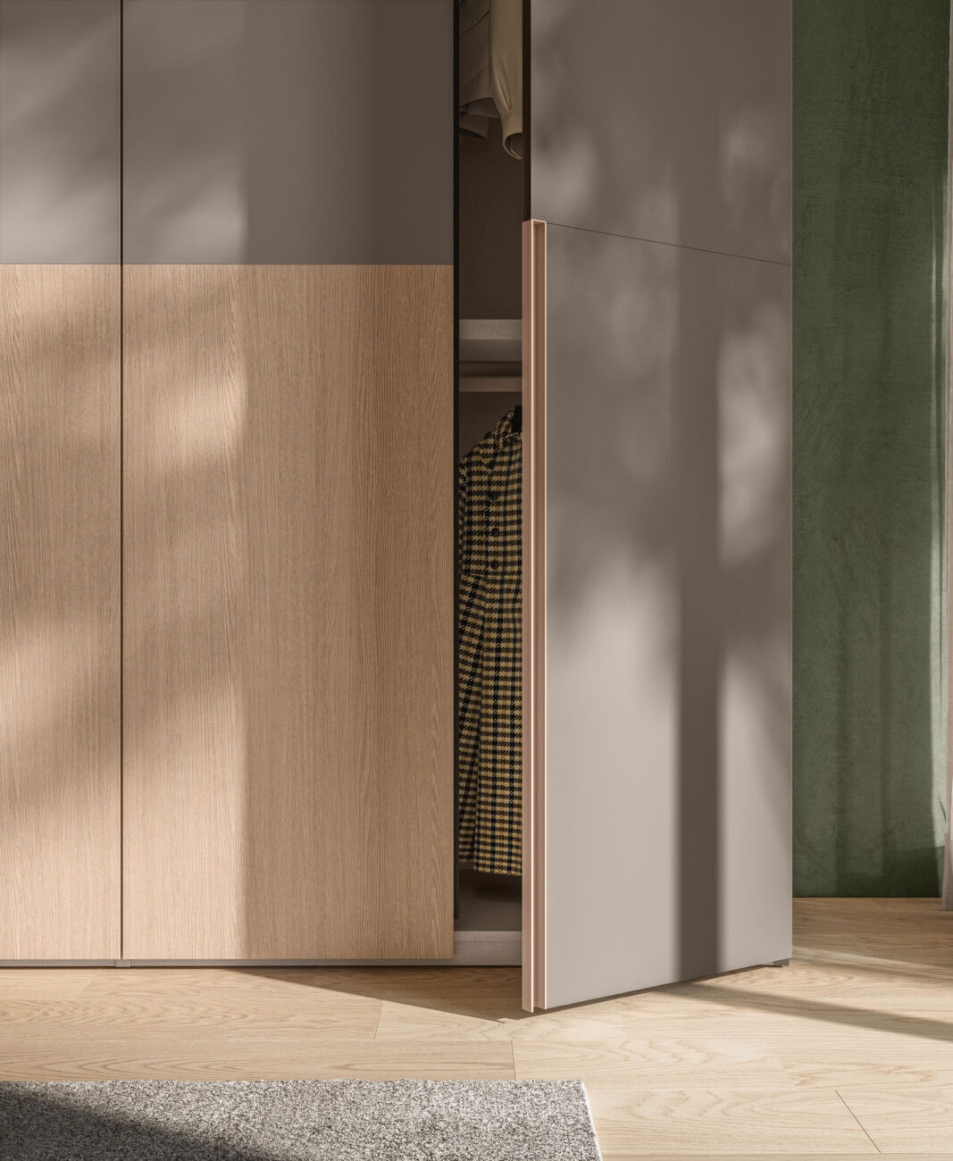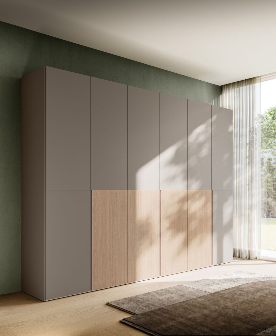 Tratto DN hinged door wardrobe in Platino and Arena finish. Structure in Cotone finish.