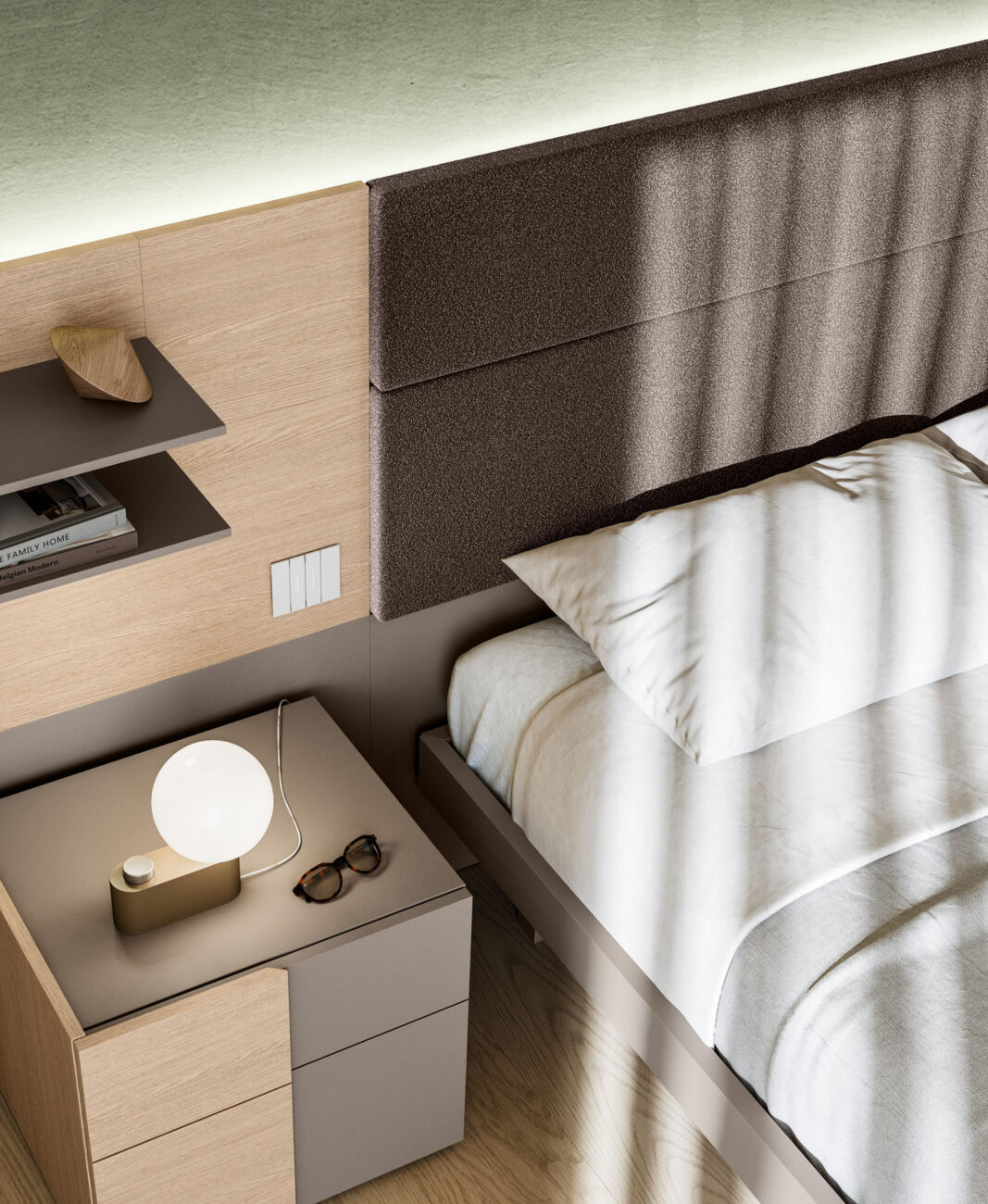 Giako Basic bed system in Arena and Platino finish, Saturno SA13 fabric, Alfa bed frame in Platino finish. Double drawer units in Arena and Platino finish, Soul 61 mirrors.