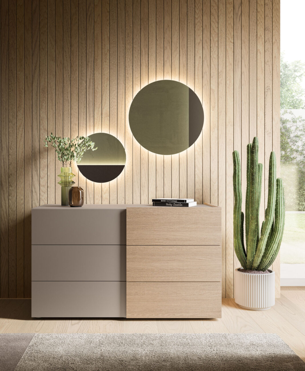 Double drawer units in Arena and Platino finish, Soul 61 mirrors. Tratto DN hinged door wardrobe in Platino and Arena finish.