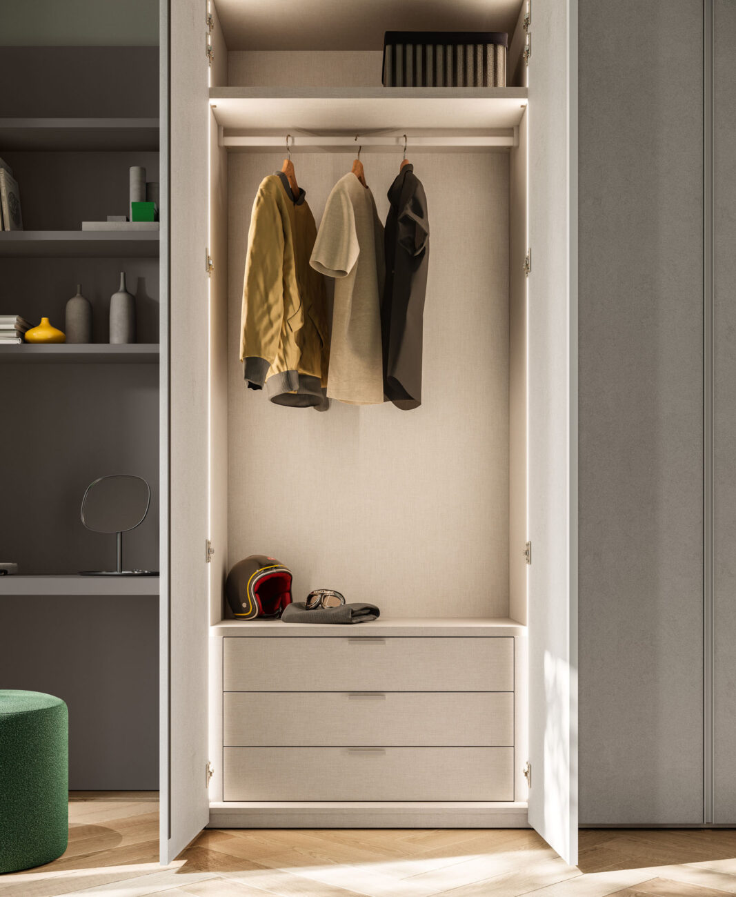 Manlò hinged door wardrobe with dedicated handle in same finish. Wardrobe equipped with shelf, hanging rail, drawer pack and vertical LED lights.