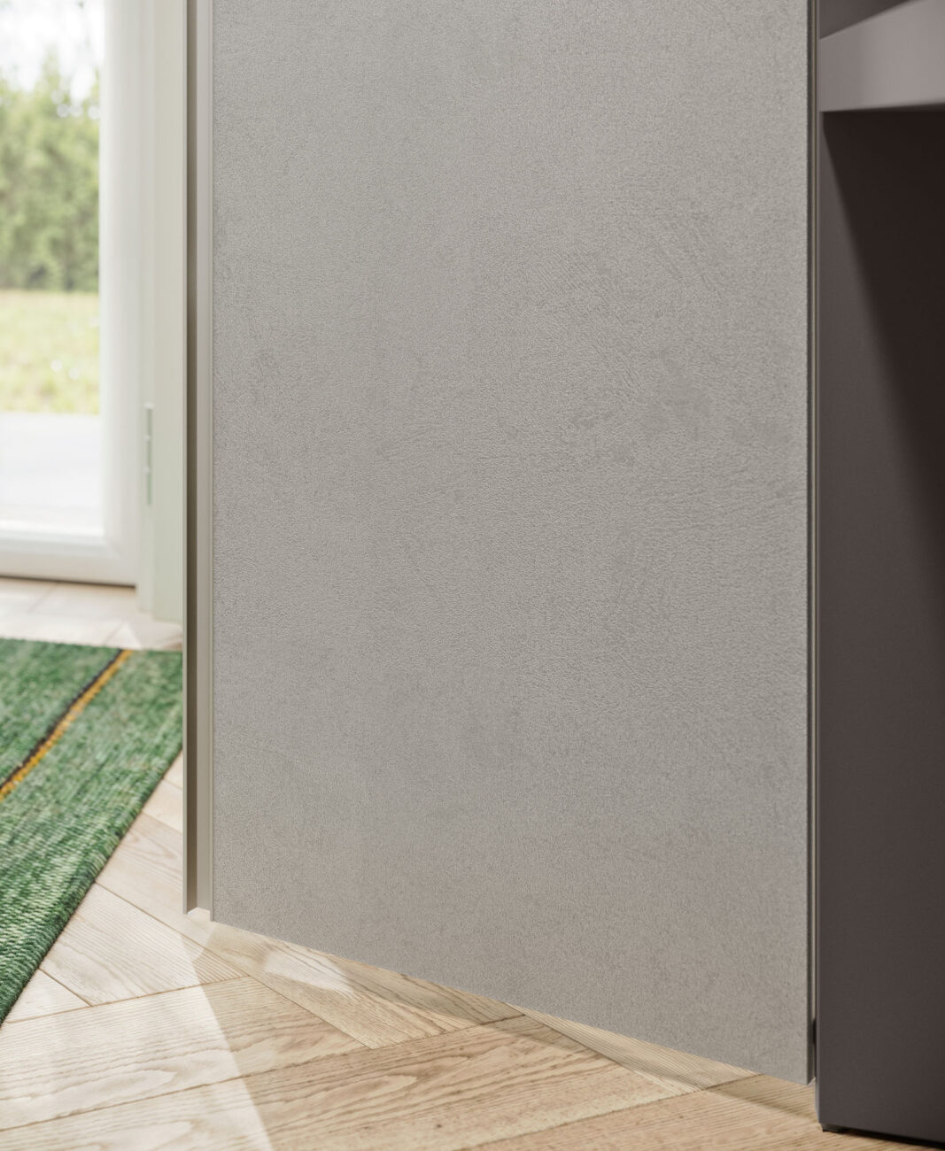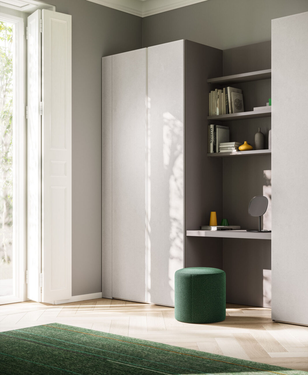 Tratto hinged door wardrobe in Seta and Cemento Tropea finish, bookshelf unit with desktop in Lavagna finish. Structure in Cotone finish.