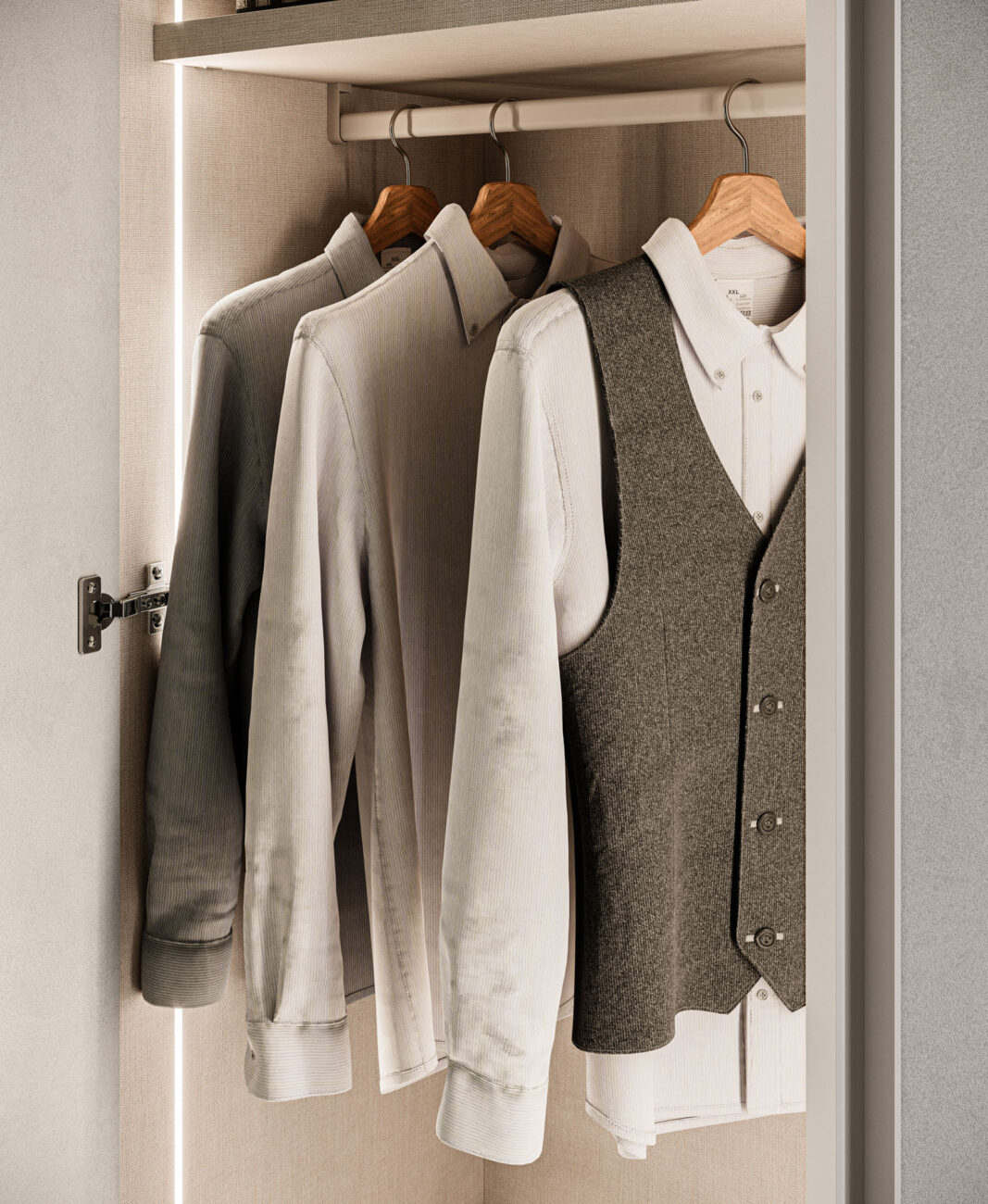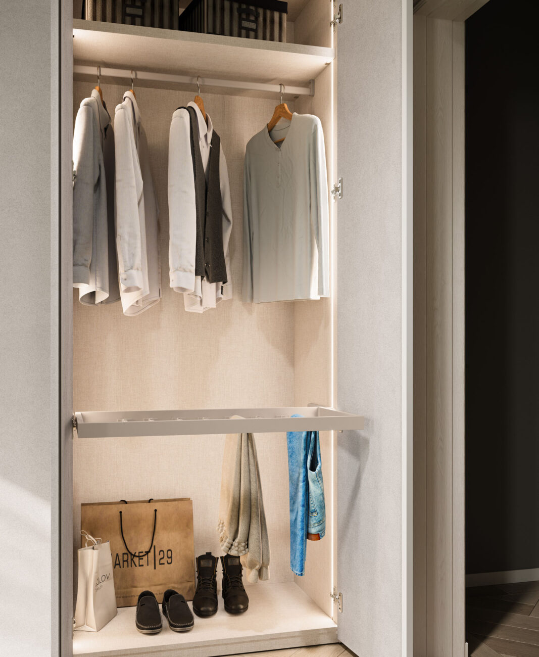 Wardrobe equipped with pull-out trouser rack, shelf, hanging rail and vertical LED lights.