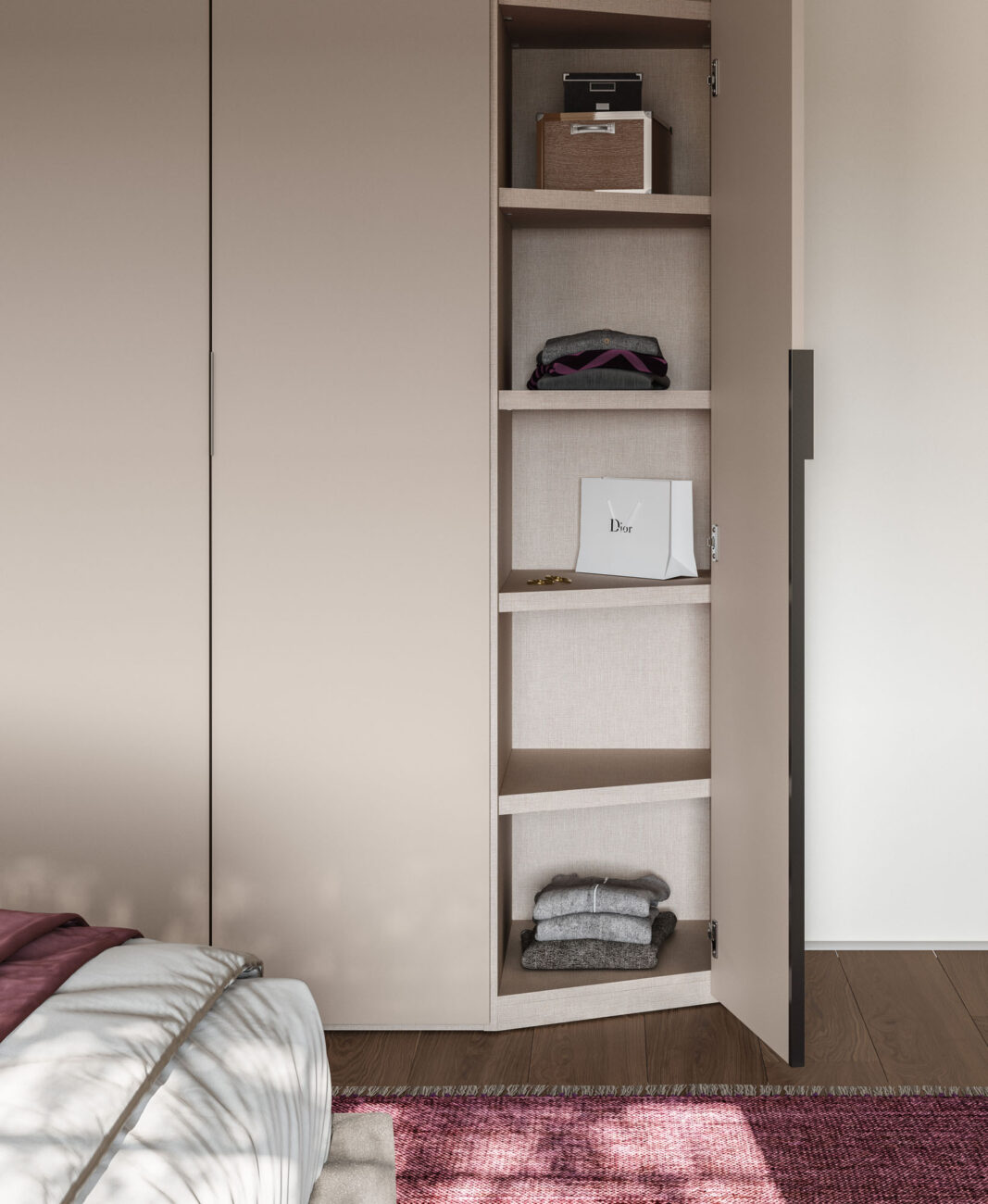 Liscia hinged door wardrobe in Tortora finish, Crea 1200 burnished handle. Nightstand wardrobe in Tortora finish and Lucas bed in Saturno SA12 fabric.