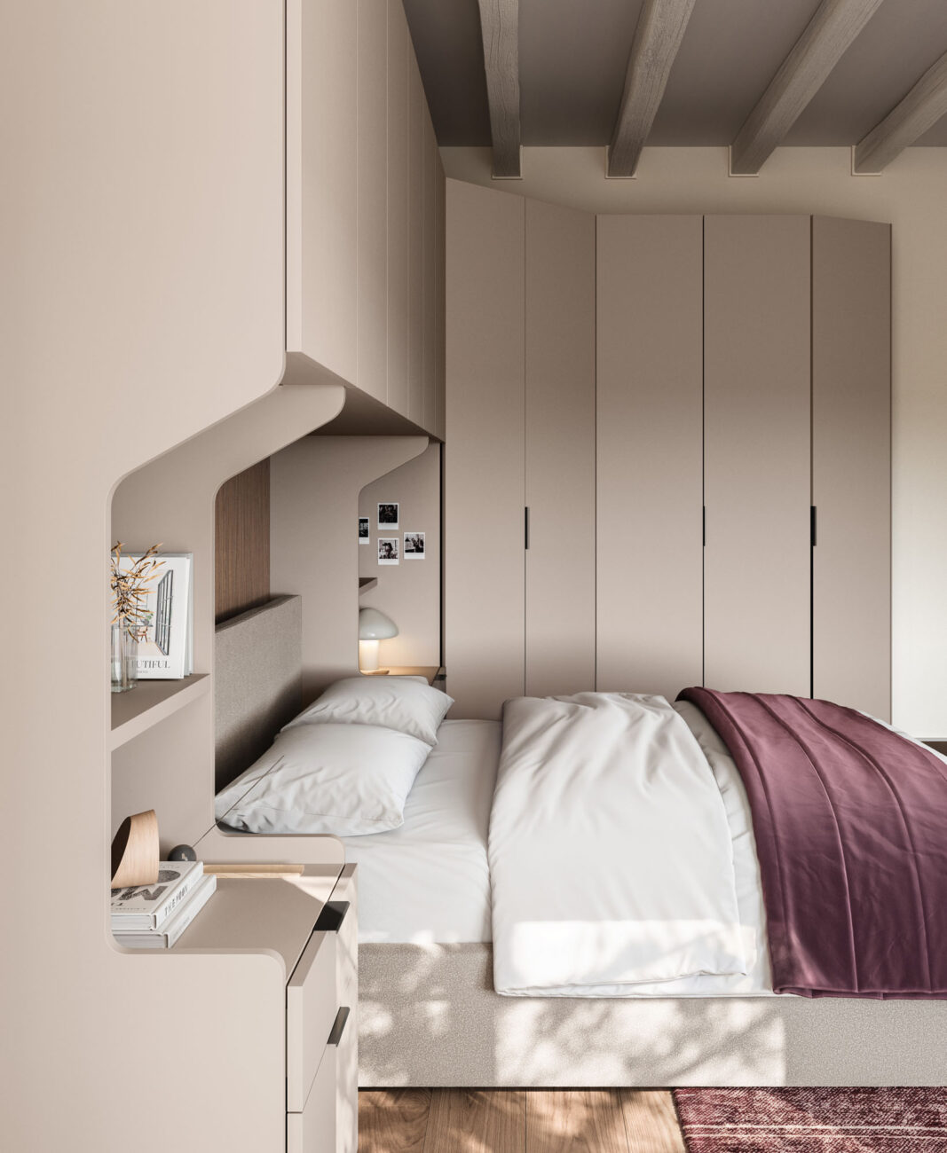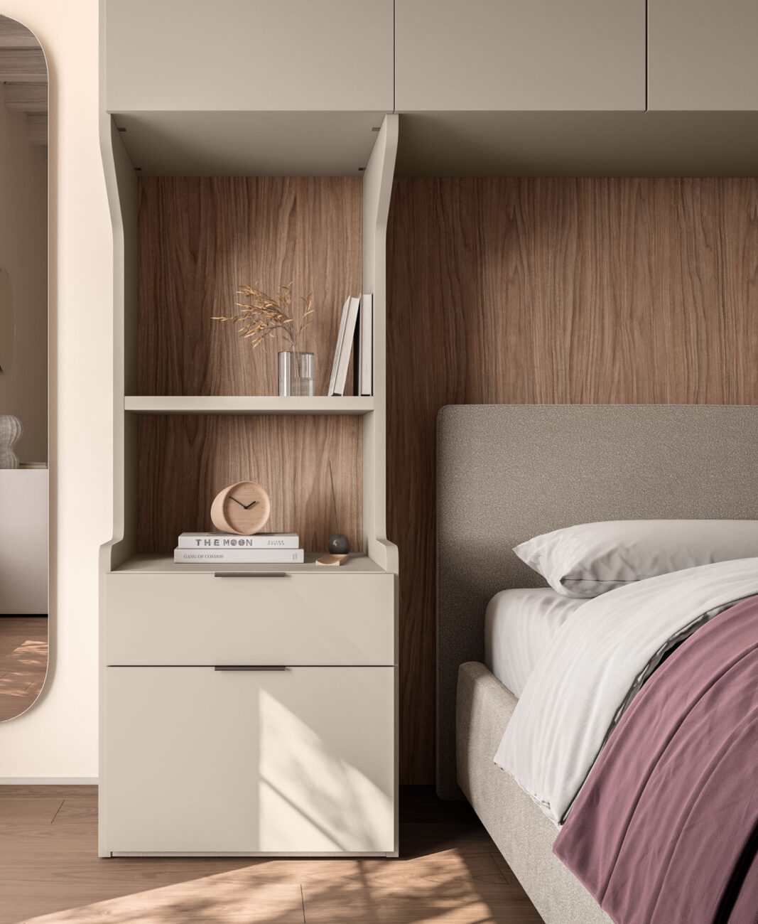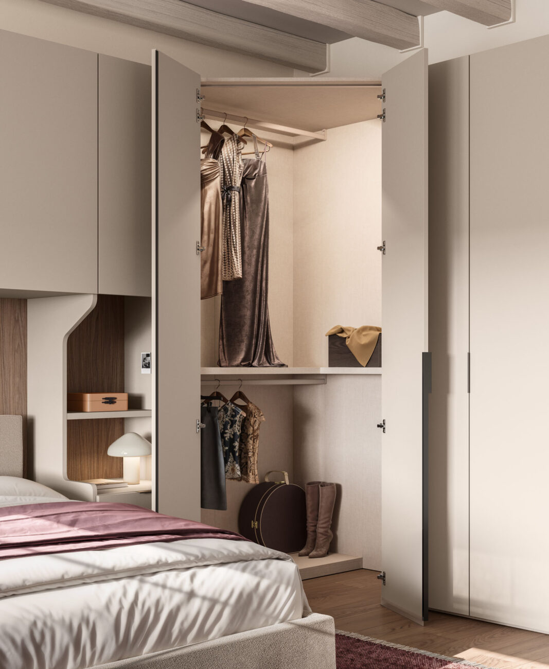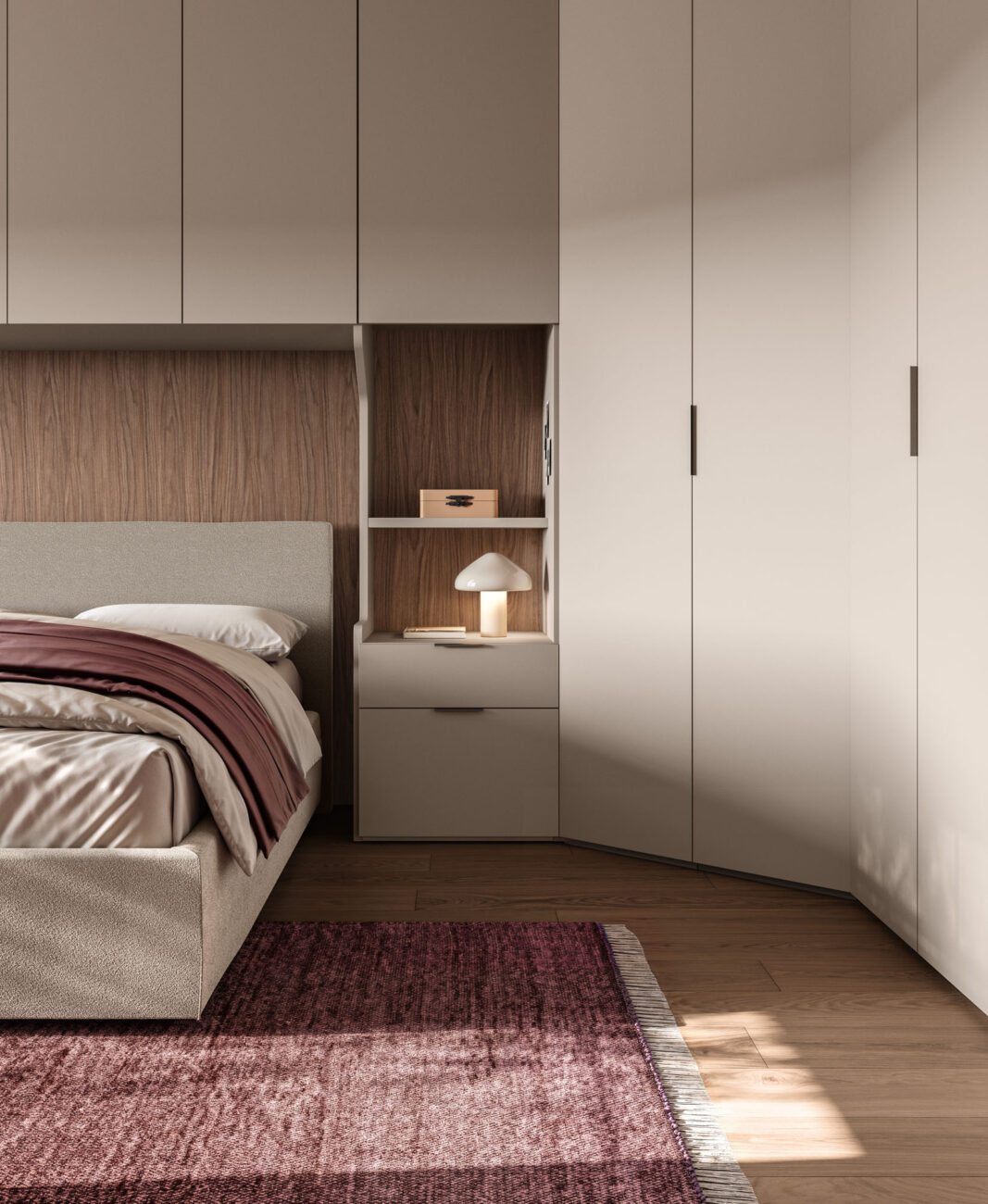 Liscia hinged door wardrobe in Tortora finish with Crea 1200, bridge wardrobe and nightstand wardrobe in Tortora and Noce finish with Crea 138 handle. Structure in Cotone finish.