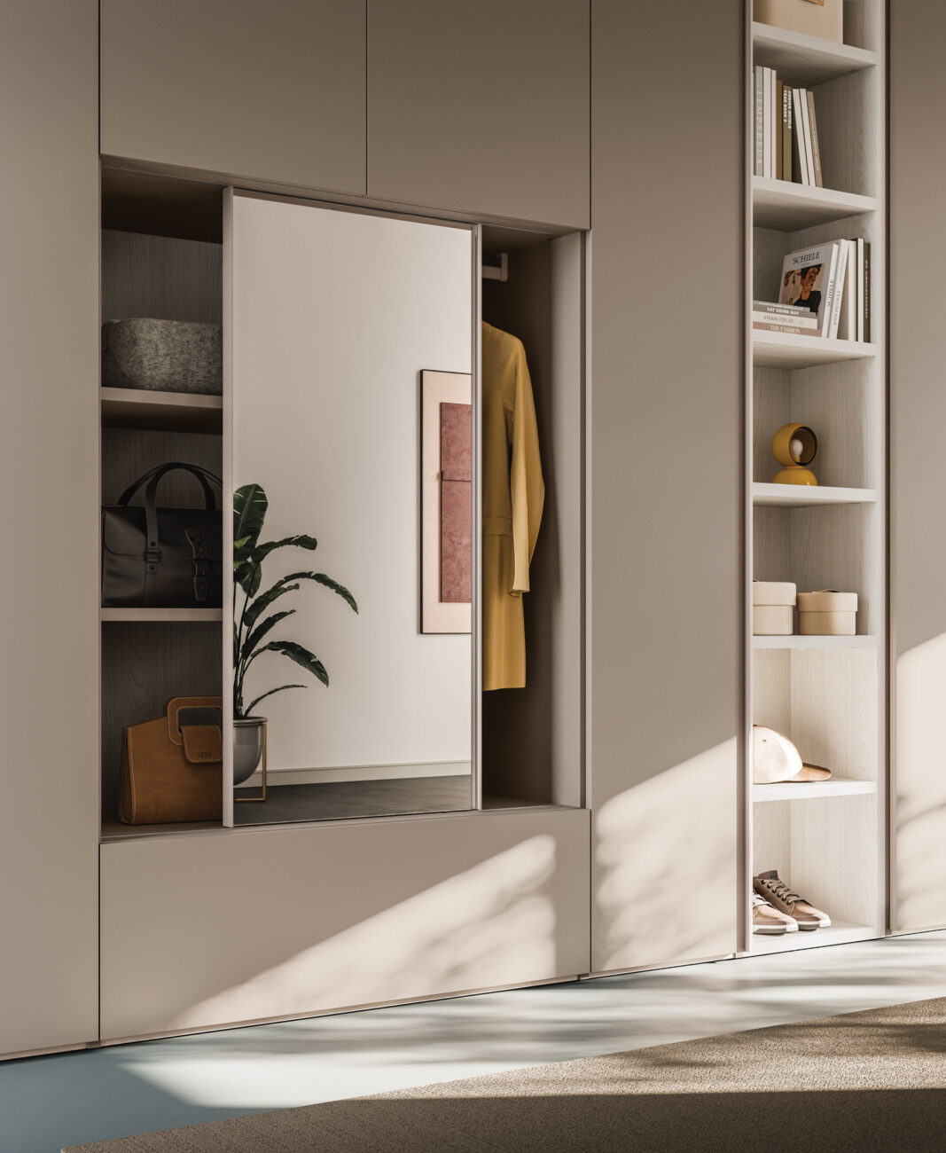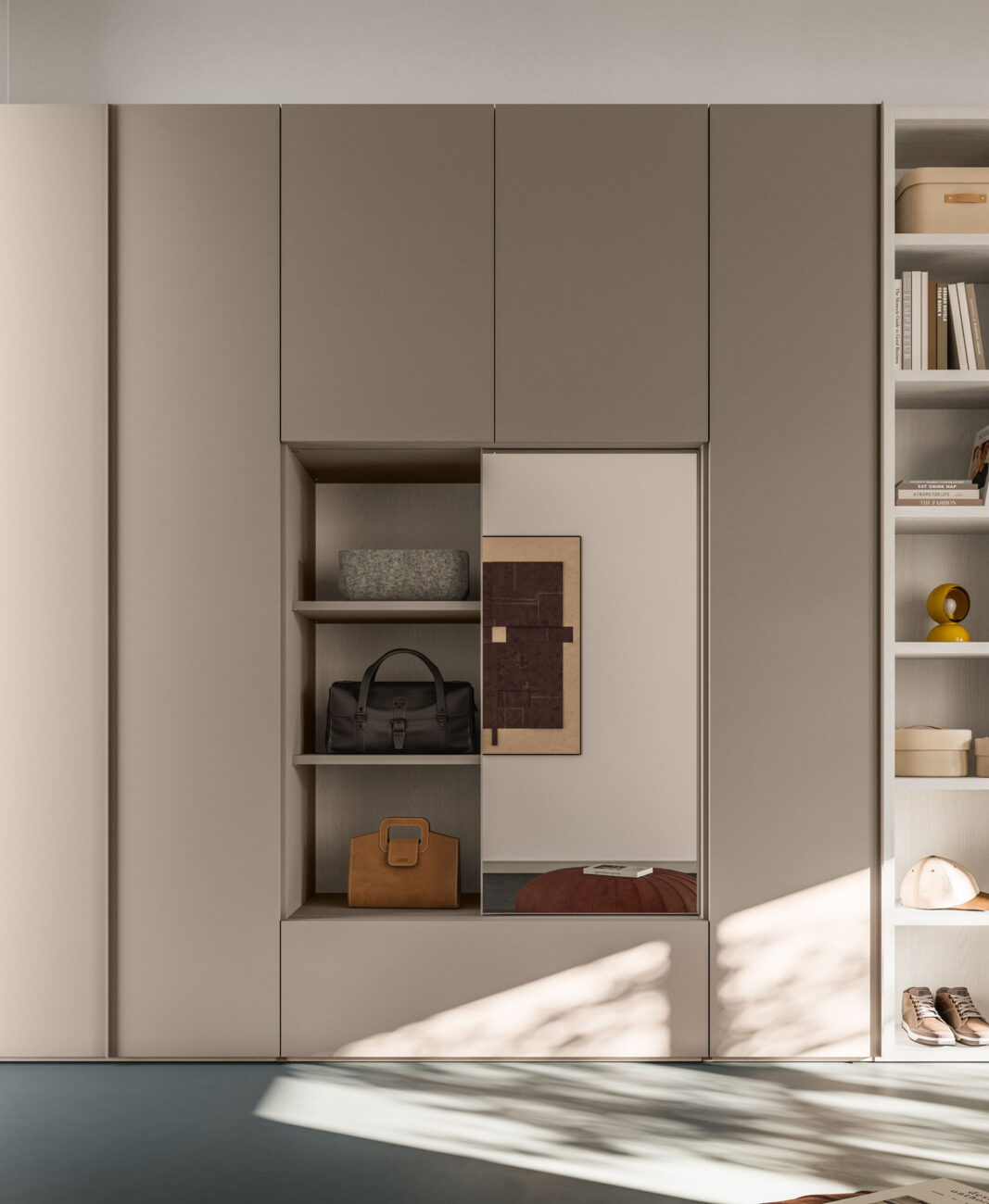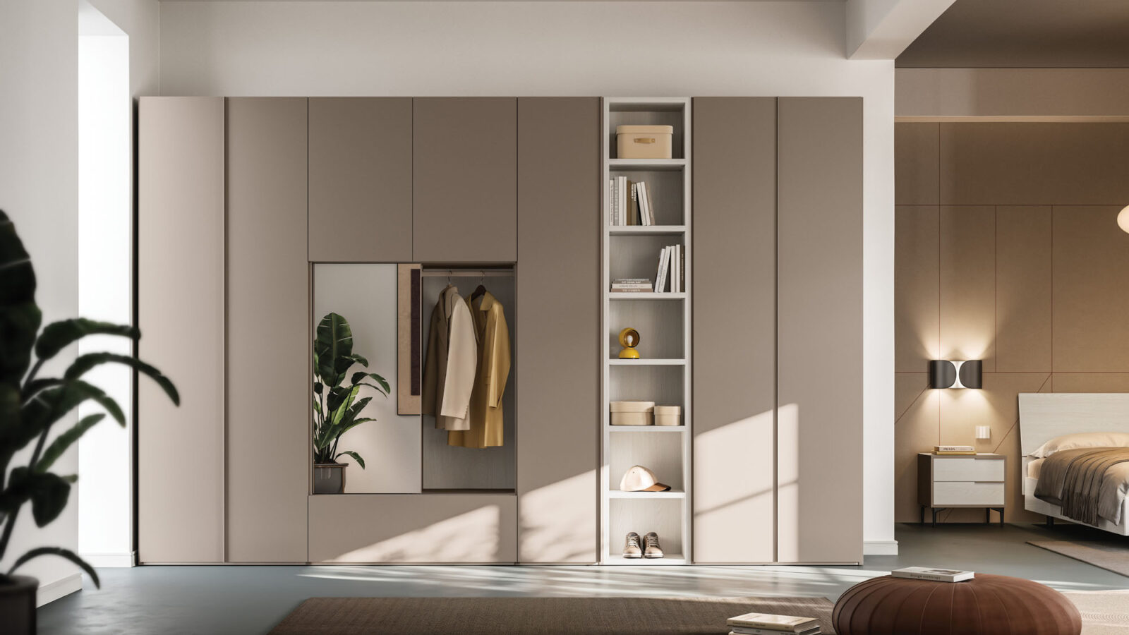 Manlò hinged door wardrobe in Platino and sliding mirror module in Sbiancato and Platino finish. Structure in Cotone finish.