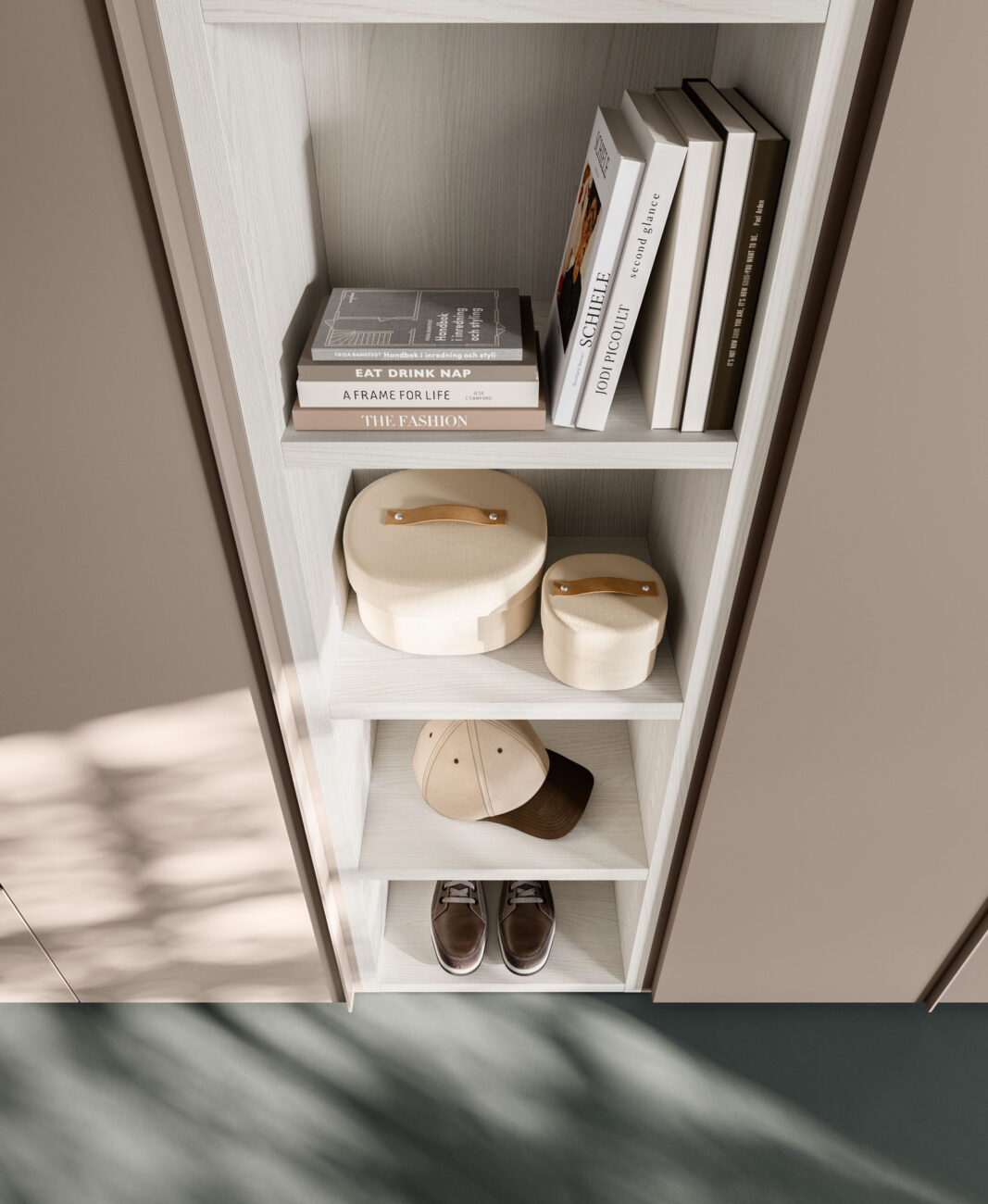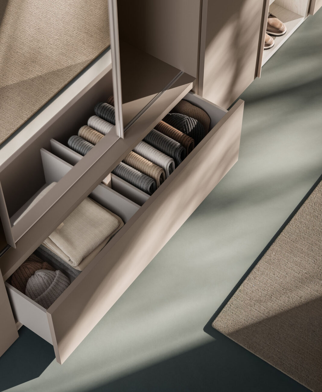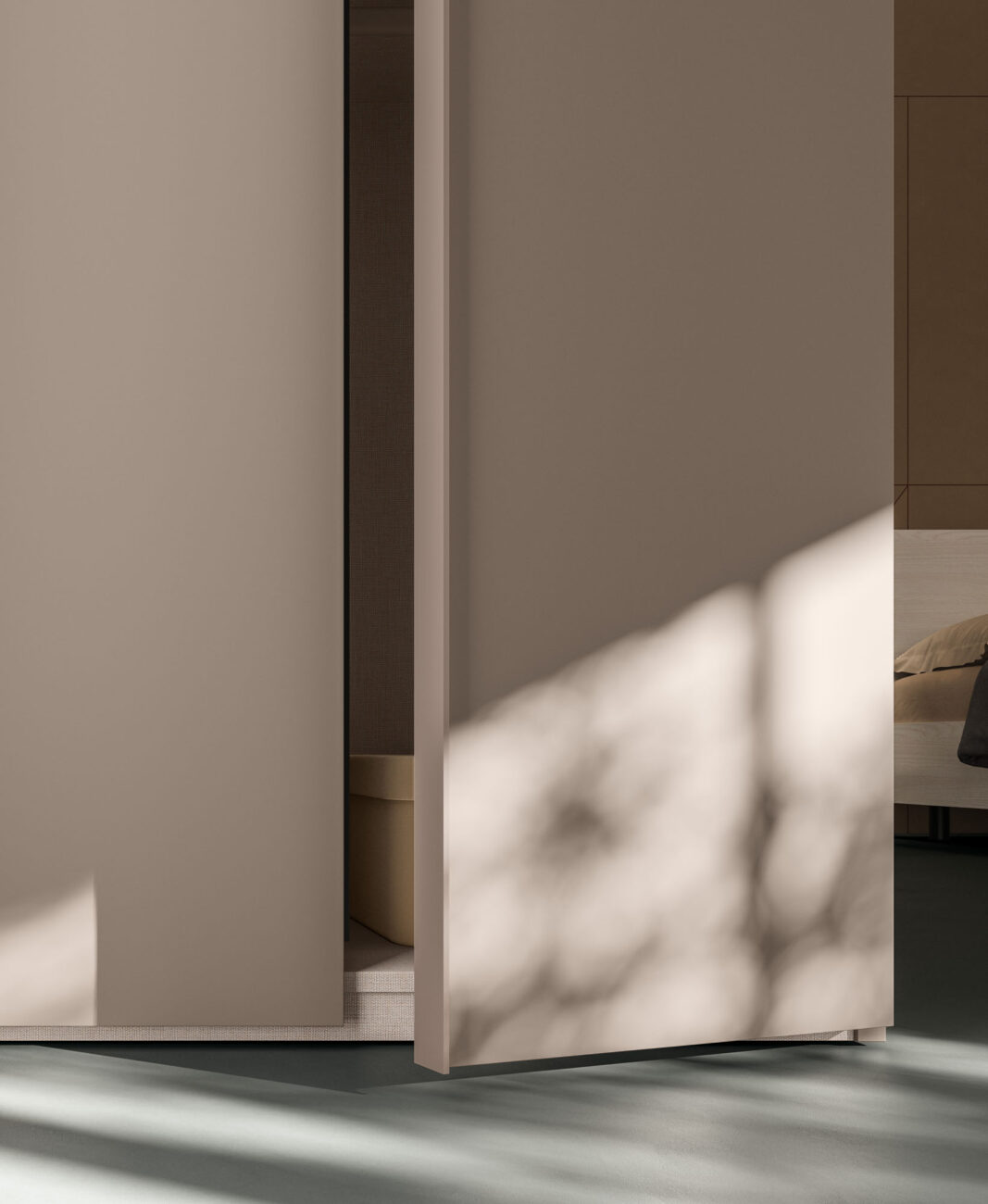 Manlò hinged door wardrobe in Platino and sliding mirror module in Sbiancato and Platino finish. Structure in Cotone finish.