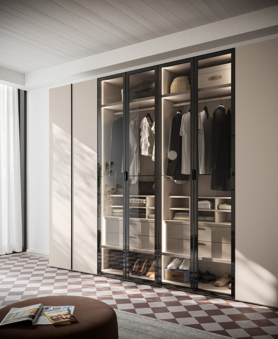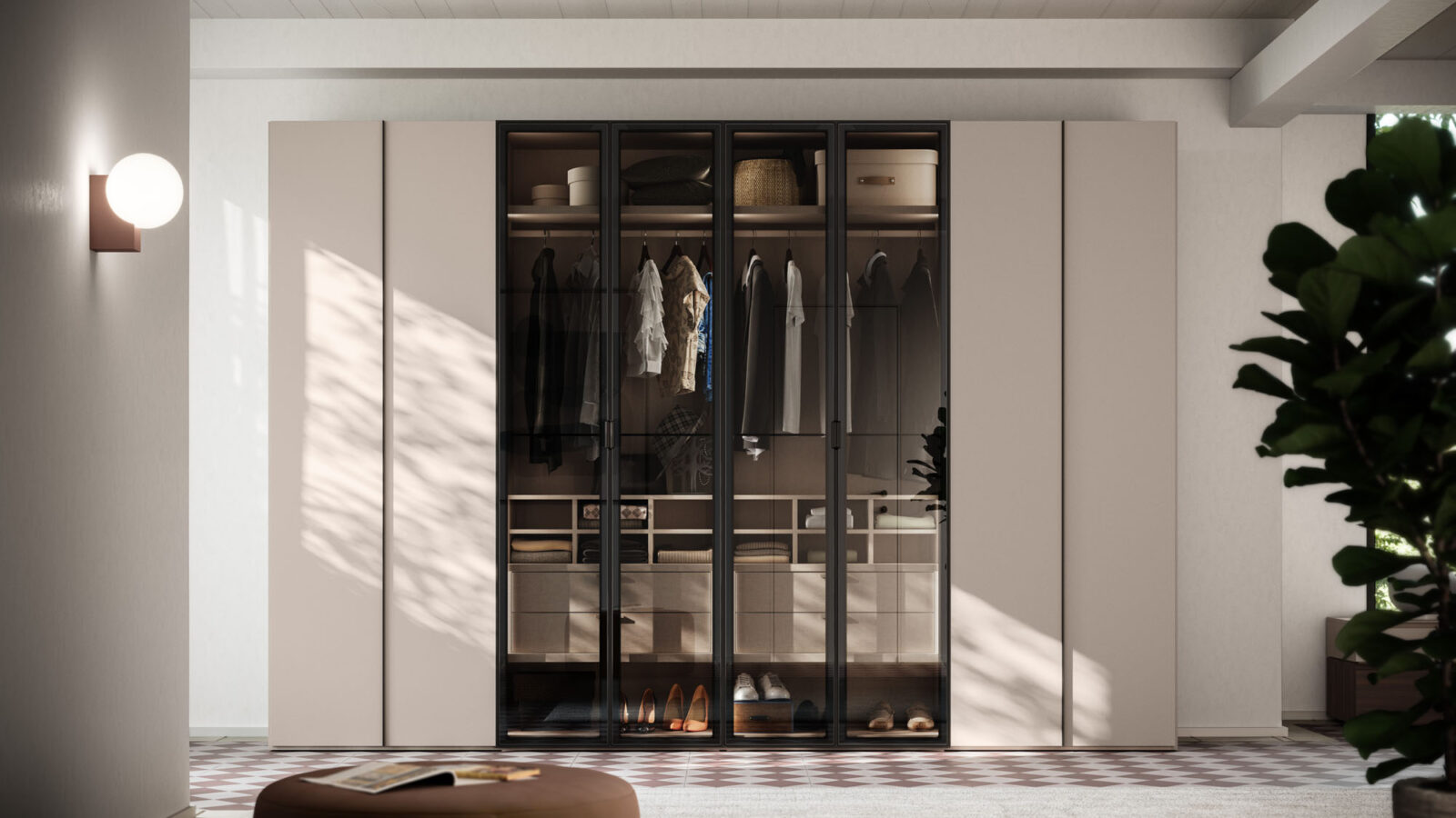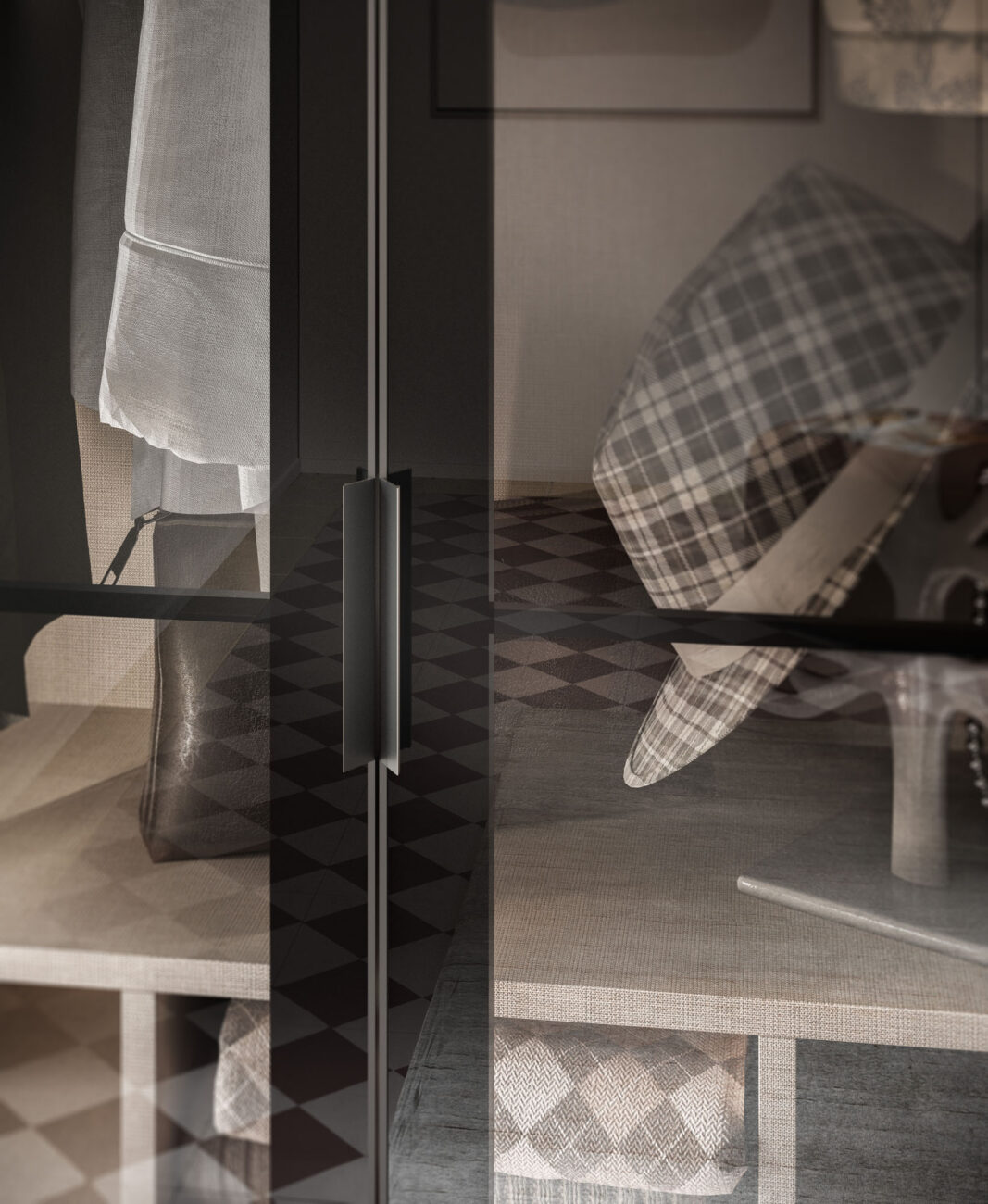 Hinged door wardrobe with Manlò doors in Tortora finish and Daly doors in Fumè glass, burnished handles and frames. Structure in Cotone finish.