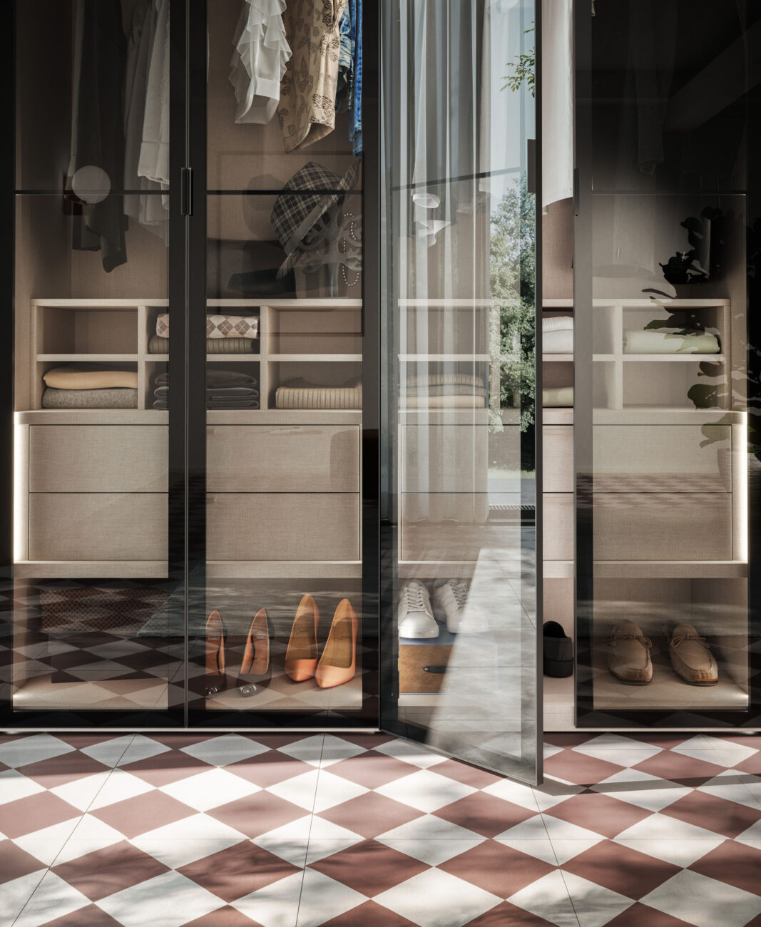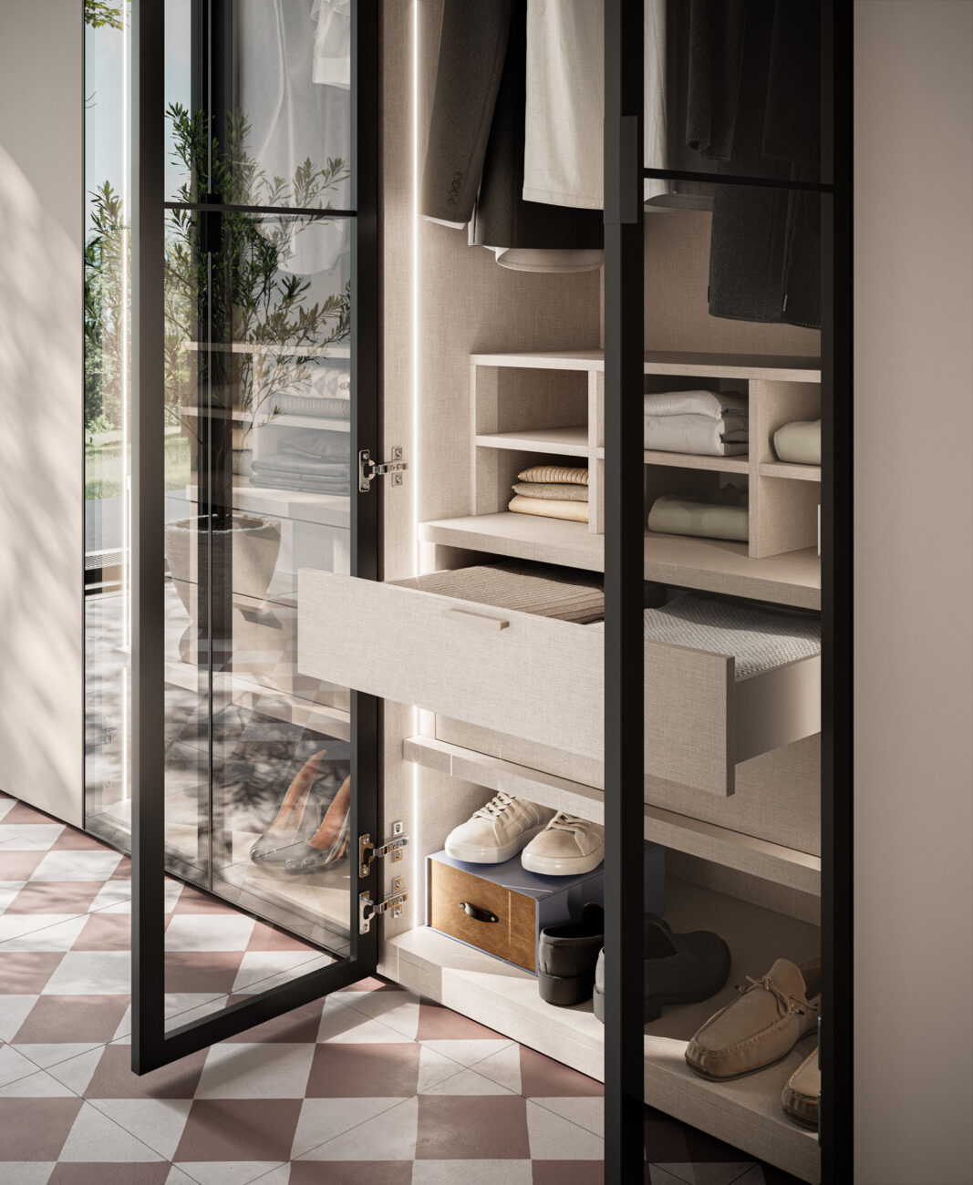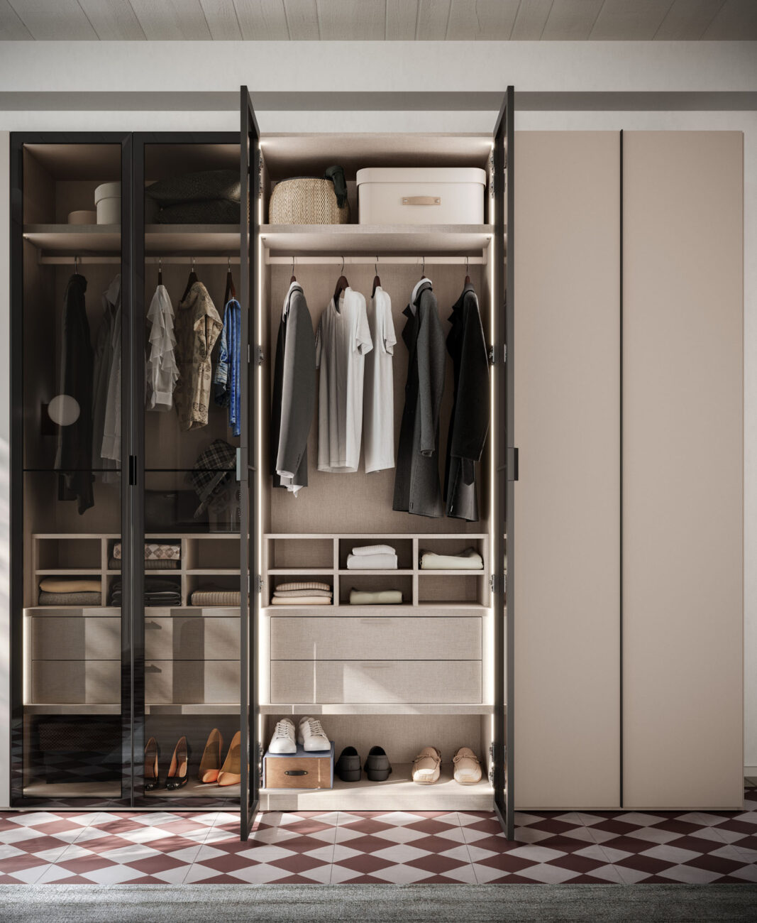 Hinged door wardrobe with Manlò doors in Tortora finish and Daly doors in Fumè glass, burnished handles and frames. Structure in Cotone finish.