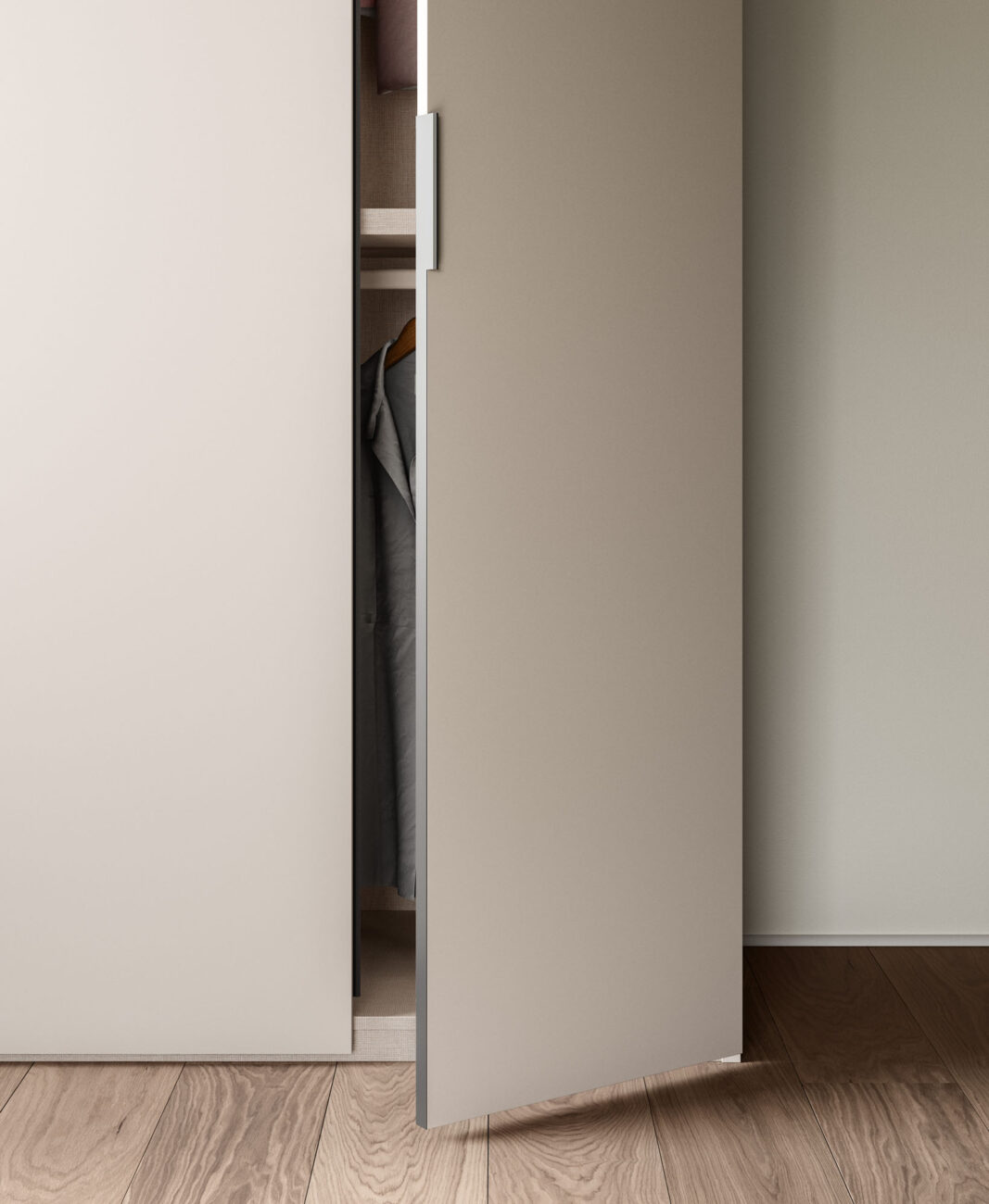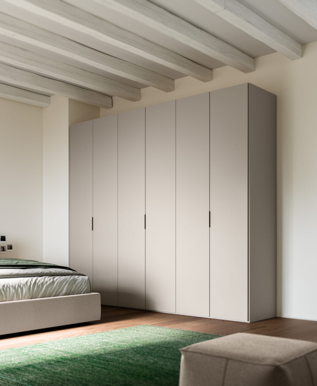 Liscia hinged door wardrobe in Velluto finish with Crea 1200 burnished handle. Structure in Cotone finish.
