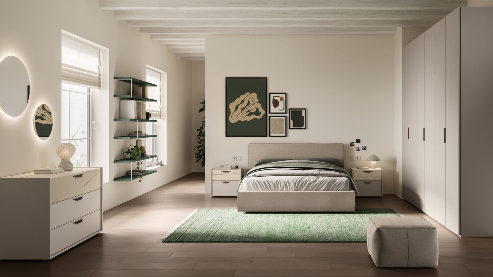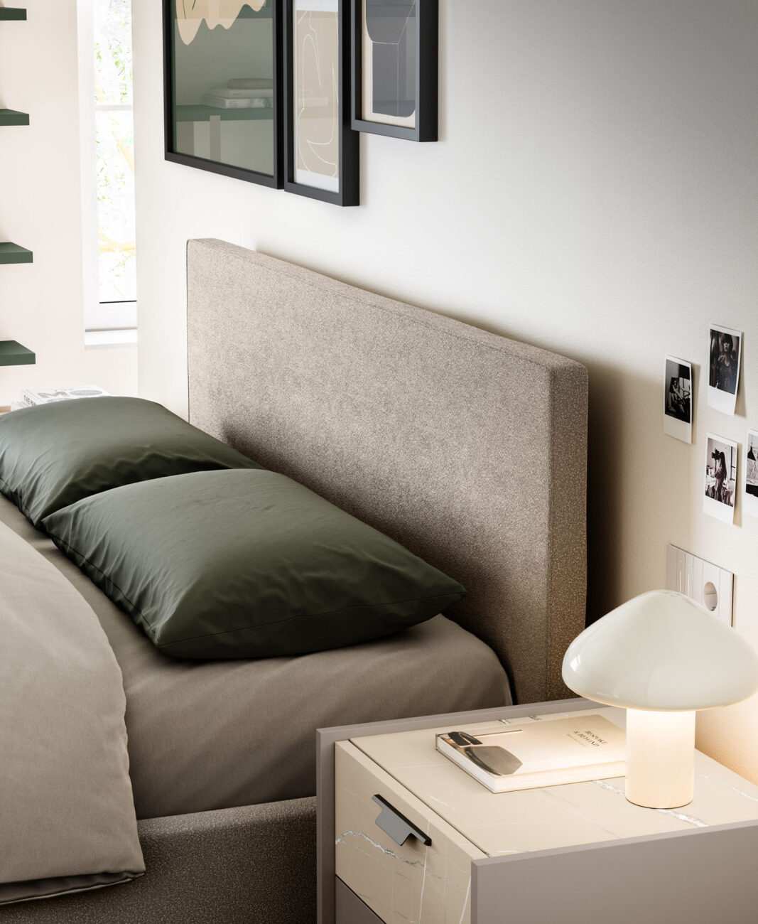 Lucas upholstered bed in Saturno SA12 fabric, Patti bedside table in Tortora finish and Marmo Tenerè with burnished handle.
