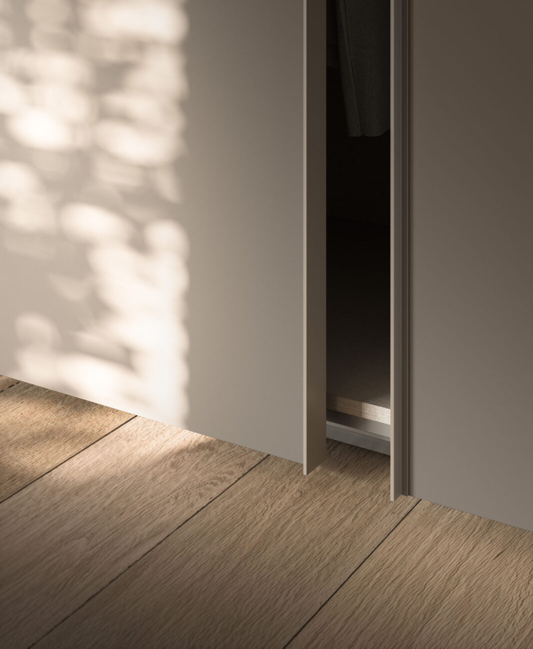 Trio sliding door wardrobe in Platino finish. Structure in Cotone finish.