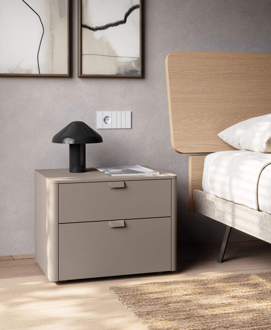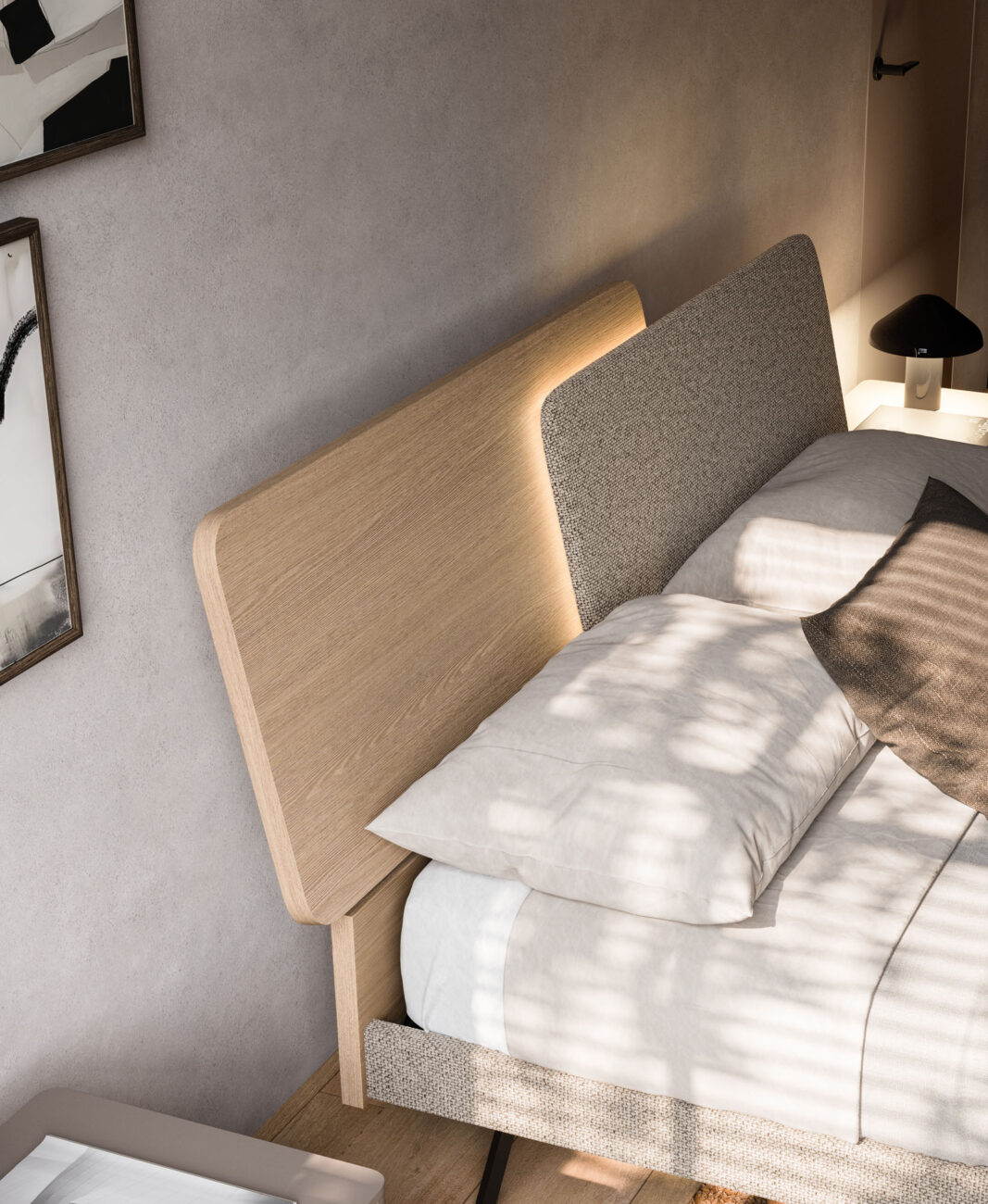 Loli upholstered bed with bed frame in Splendor SP11 fabric and Arena finish. Chiara drawer units in Platino finish and Soul 21 backlit mirror.