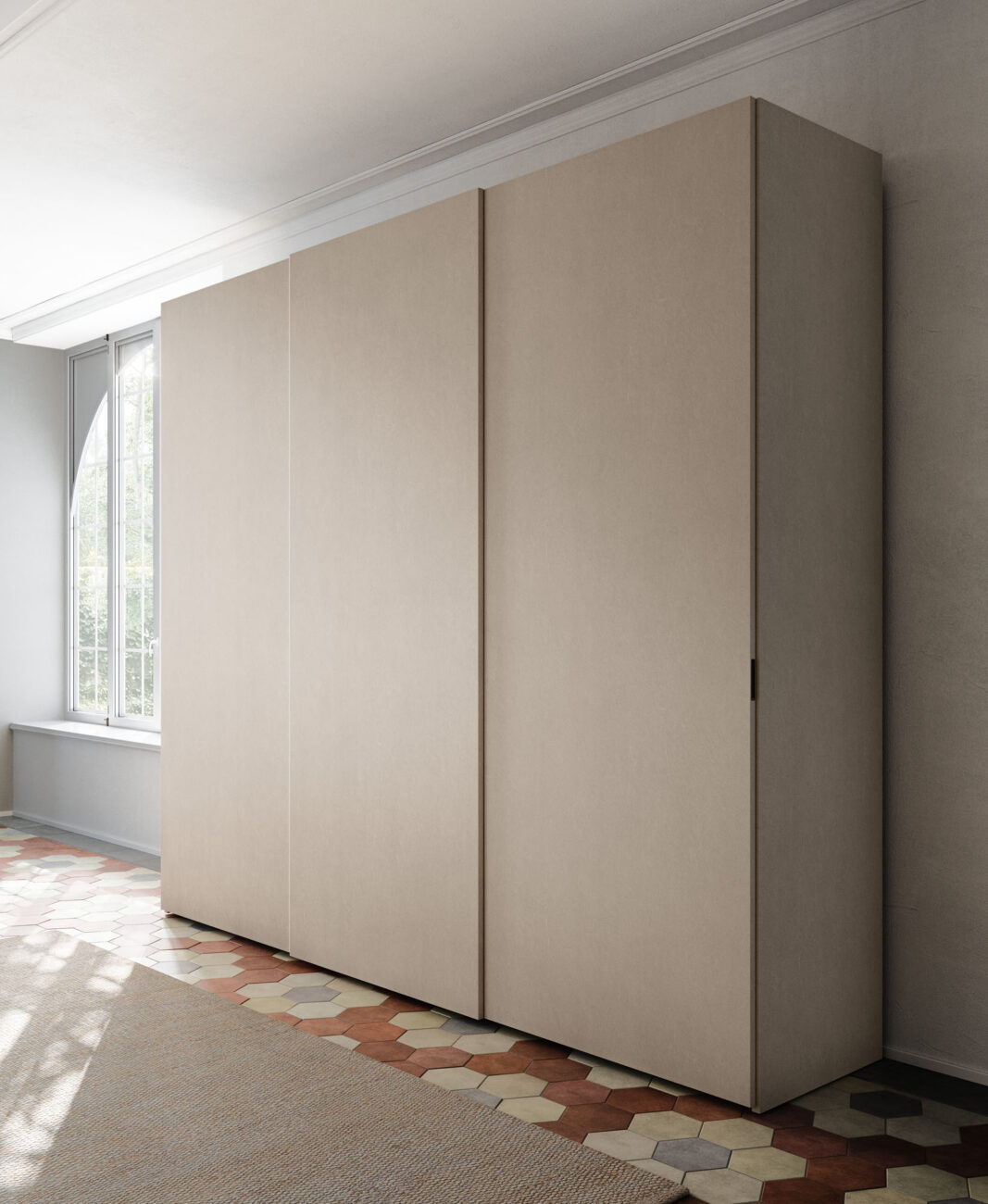Liscia sliding door wardrobe in Dekor Canapa finish with Flip burnished handle. Structure in Cotone finish.