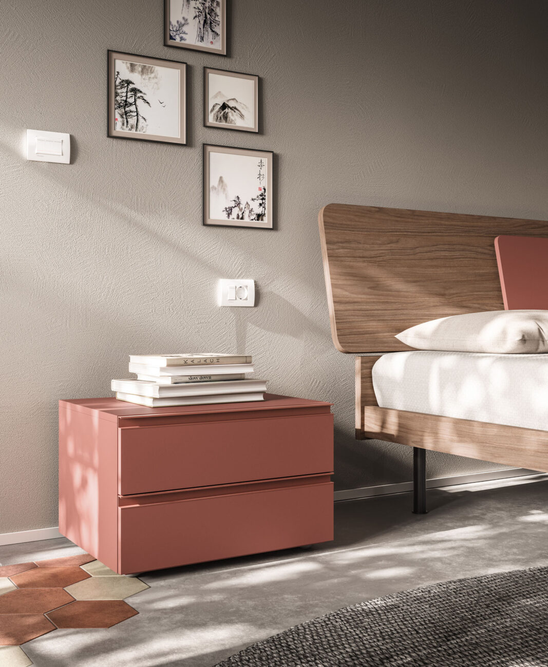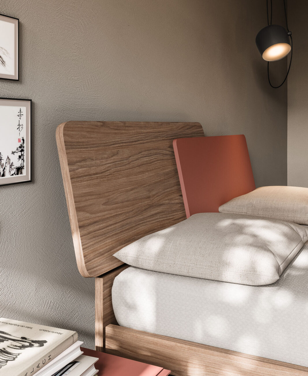 Loli bed with Alfa bed frame in Noce and Mattone finish.