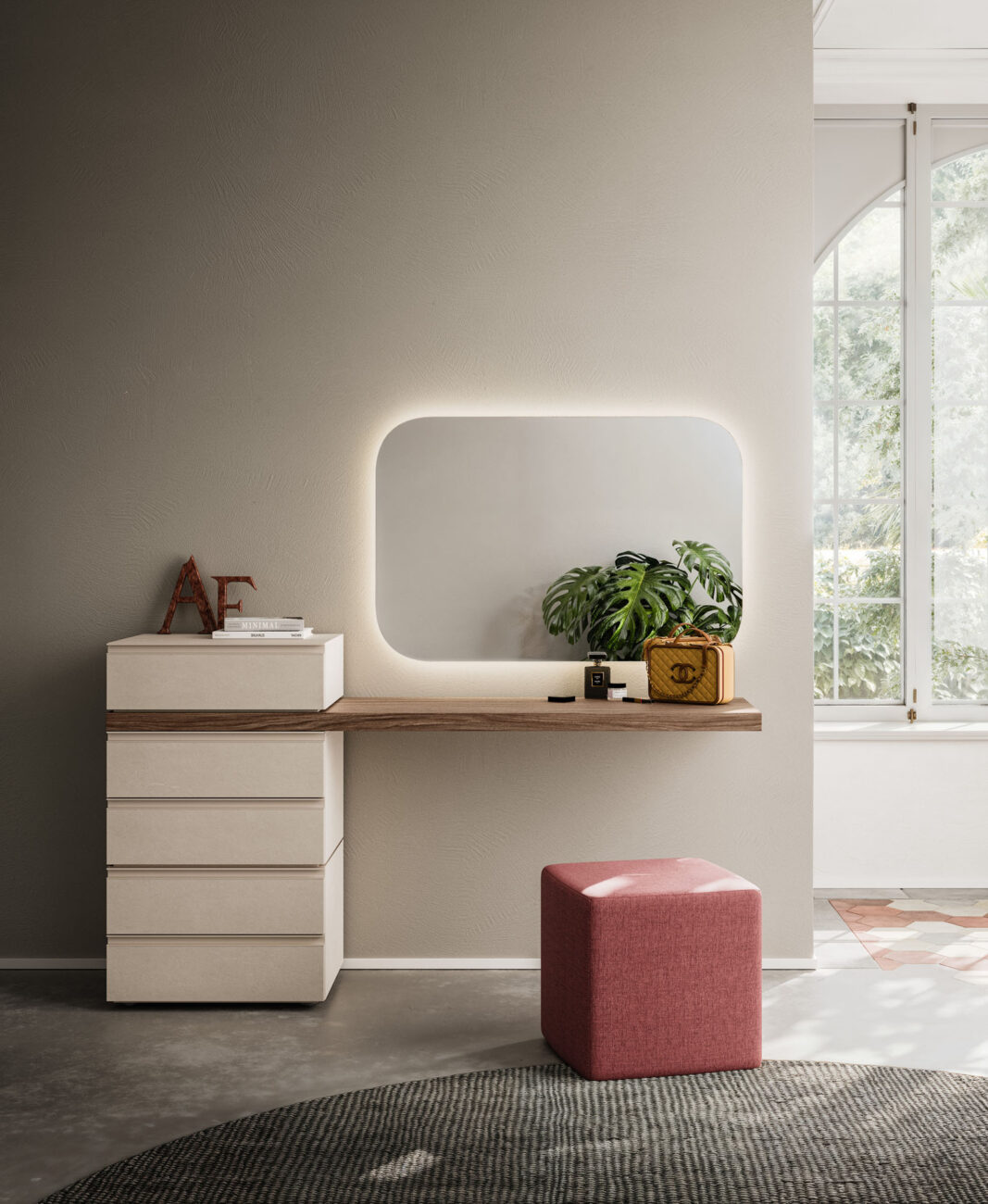Bravo drawer units in Dekor Canapa finish, consolle in Noce finish, Soul 31 mirror, Cubo pouf in Dafne DA25 fabric. Liscia sliding door wardrobe in Dekor Canapa finish with Flip burnished handle.
