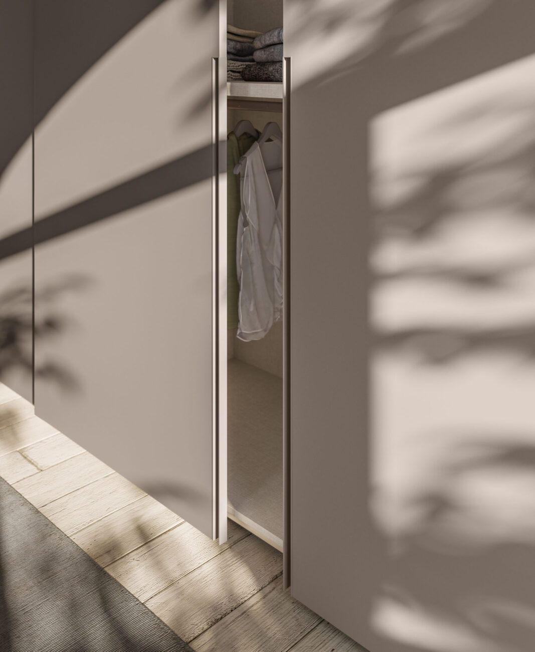 Tratto 1200 sliding door wardrobe in Platino finish. Structure in Cotone finish.