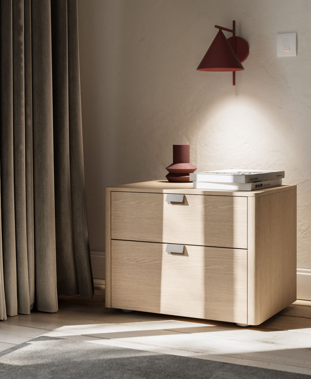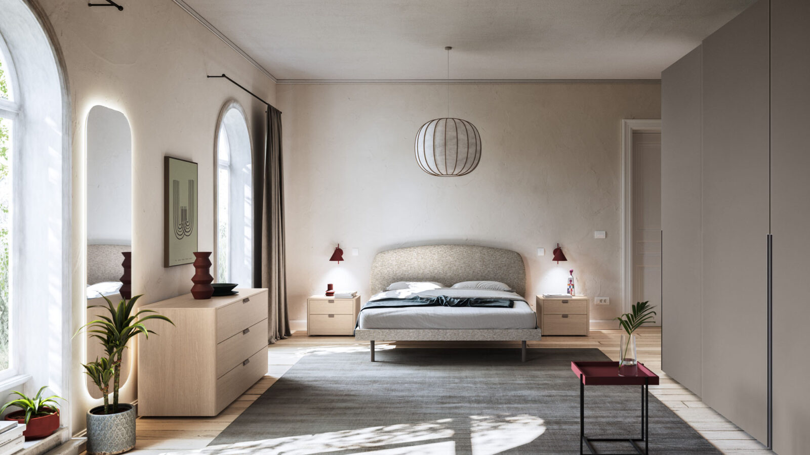 Park upholstered bed with Iota bed frame in Clara CL01 fabric. Chiara drawer units in Arena finish with Platino handles, Soul 21 mirror.