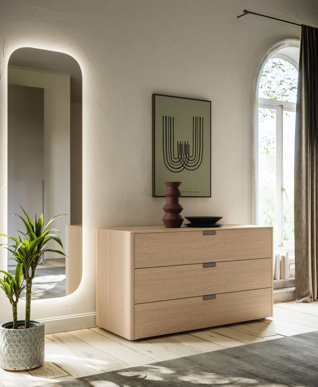 Chiara drawer units in Arena finish with Platino handles. Tratto 1200 sliding door wardrobe in Platino finish.