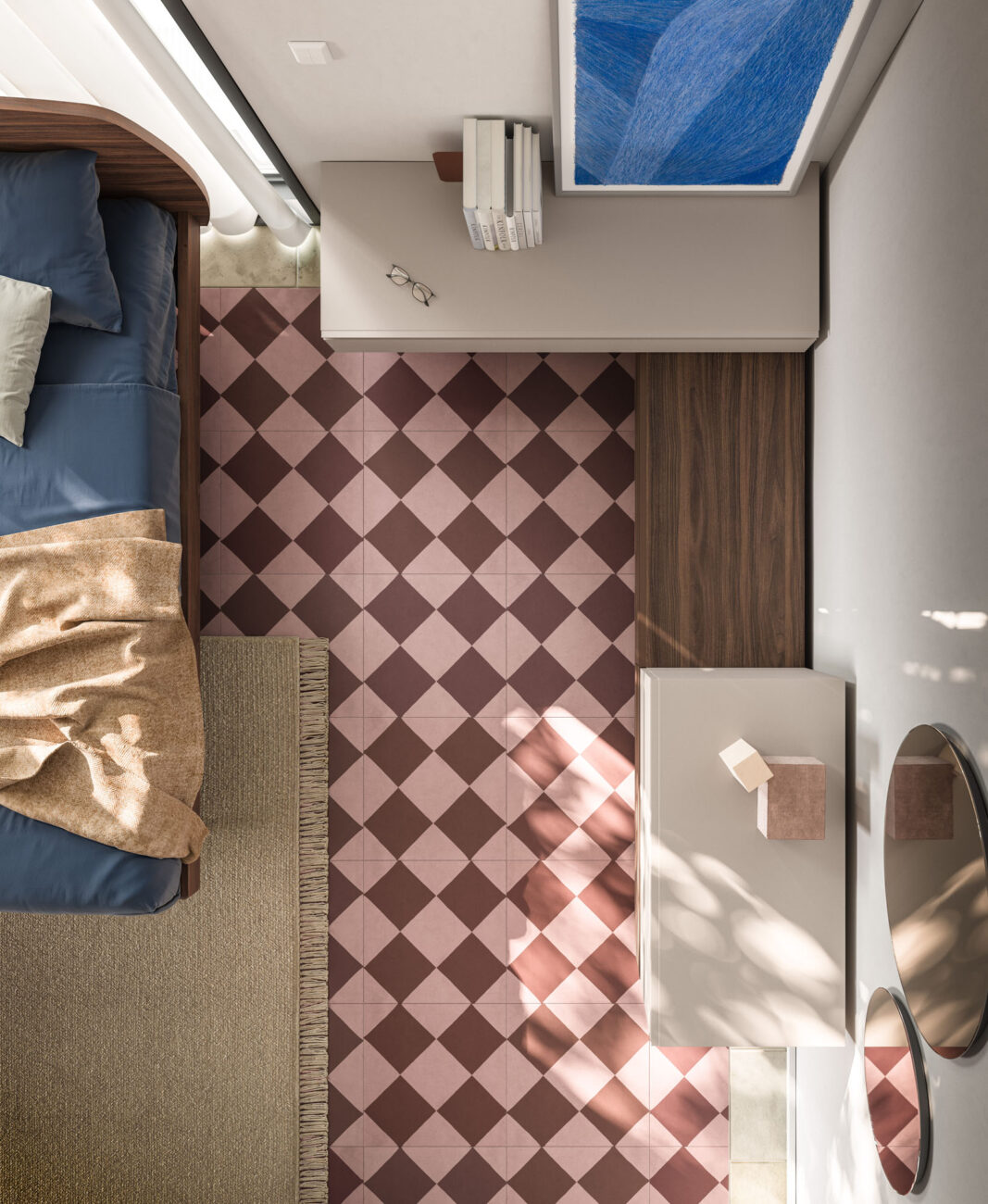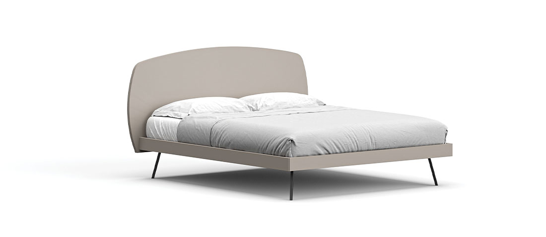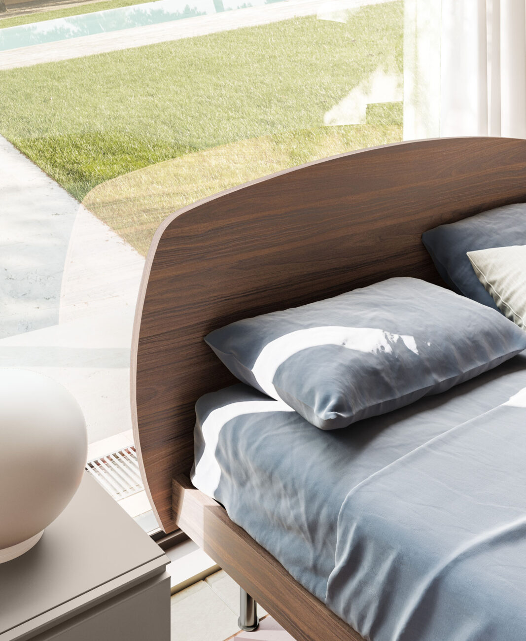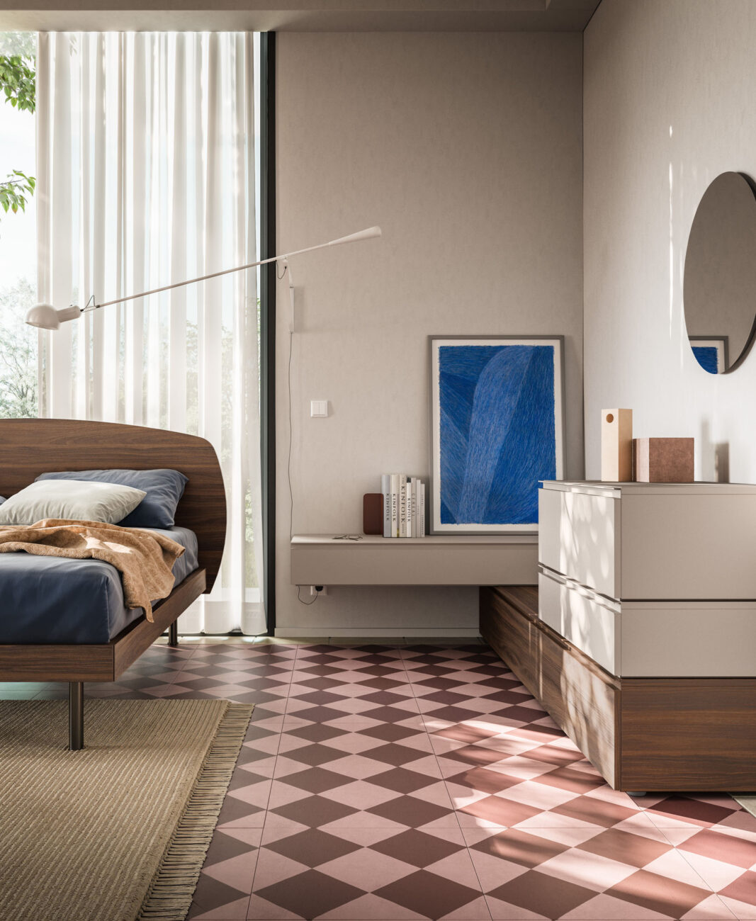 Park bed with Alfa bed frame in Cotto finish. Bravo bedside table with Tratto handle in Cotto and Tortora finish.