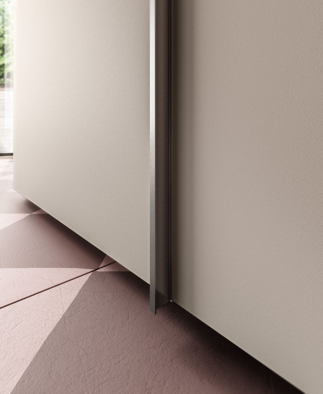 Bravo drawer units with Tratto handle in Cotto e Tortora finish, Soul 61 mirrors. Manlò hinged door wardrobe in Tortora finish with burnished handles.