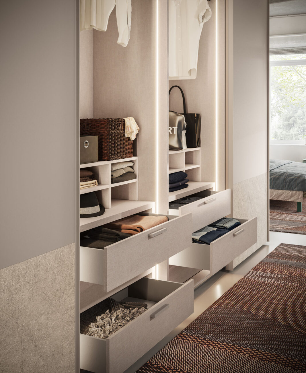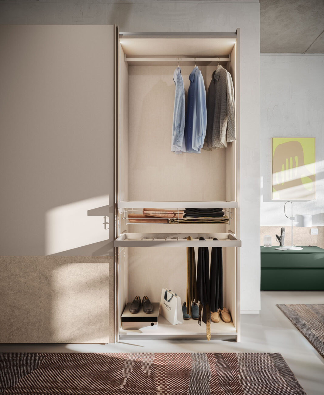 Level DN sliding wardrobe in Tortora and Roccia Piacenza finish, dedicated handle in same finish. Wardrobe equipped with a tube, pull-out basket, pull-out trouser rack and vertical LED lights.
