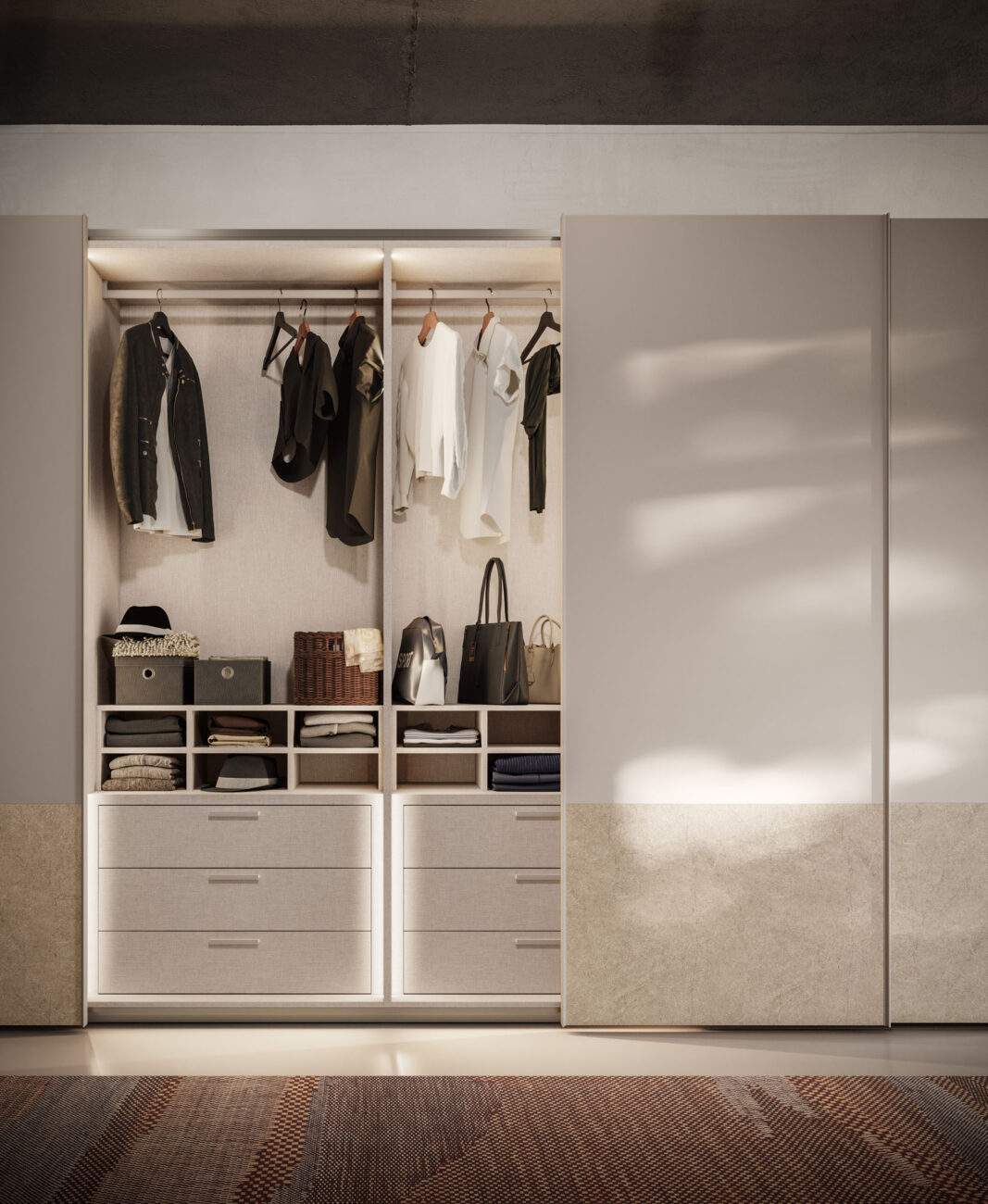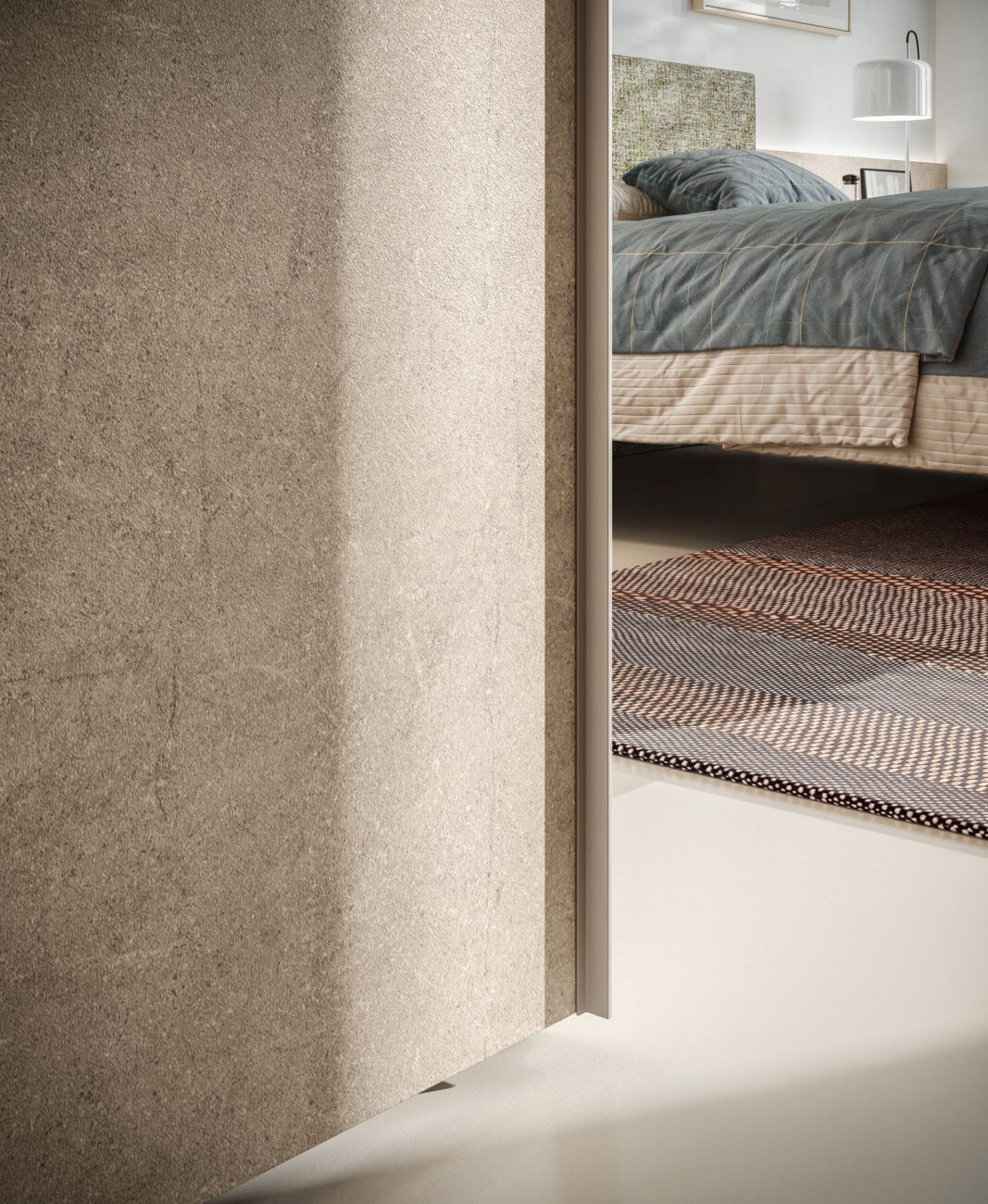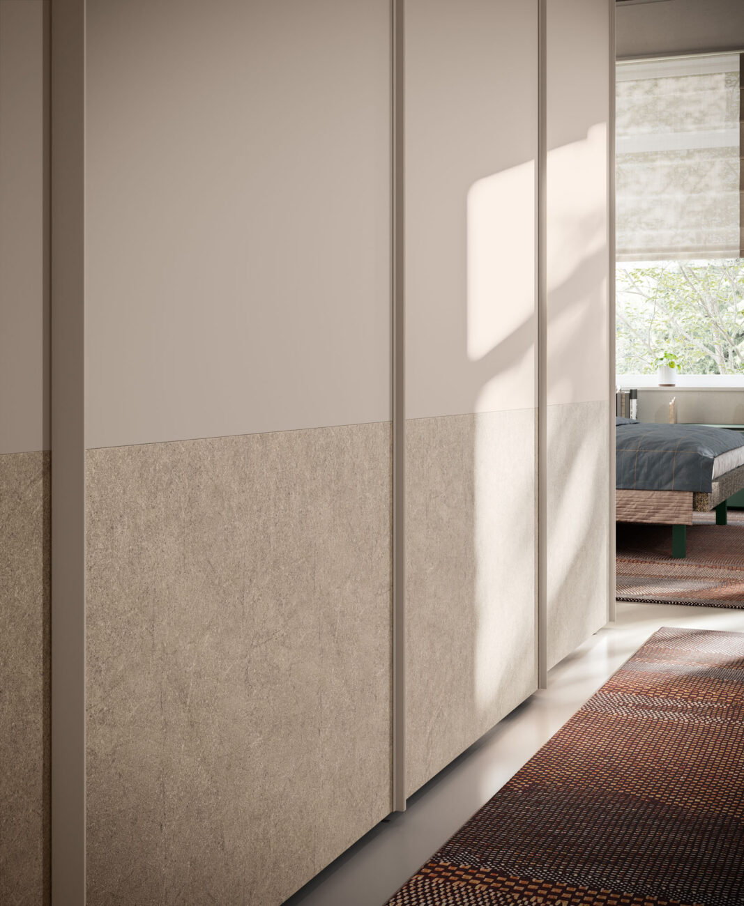 Level DN sliding door wardrobe in Tortora and Roccia Piacenza finish. Structure in Cotone finish.