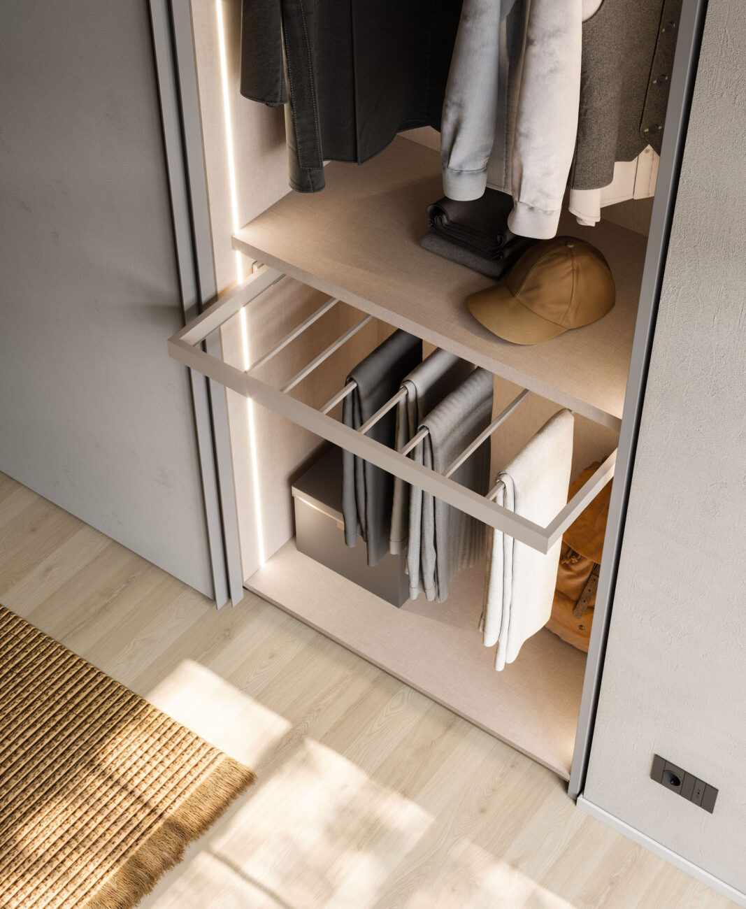 Wardrobe equipped with hanging rail, shelf, pull-out trouser rack and vertical LED lights.