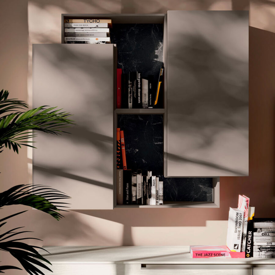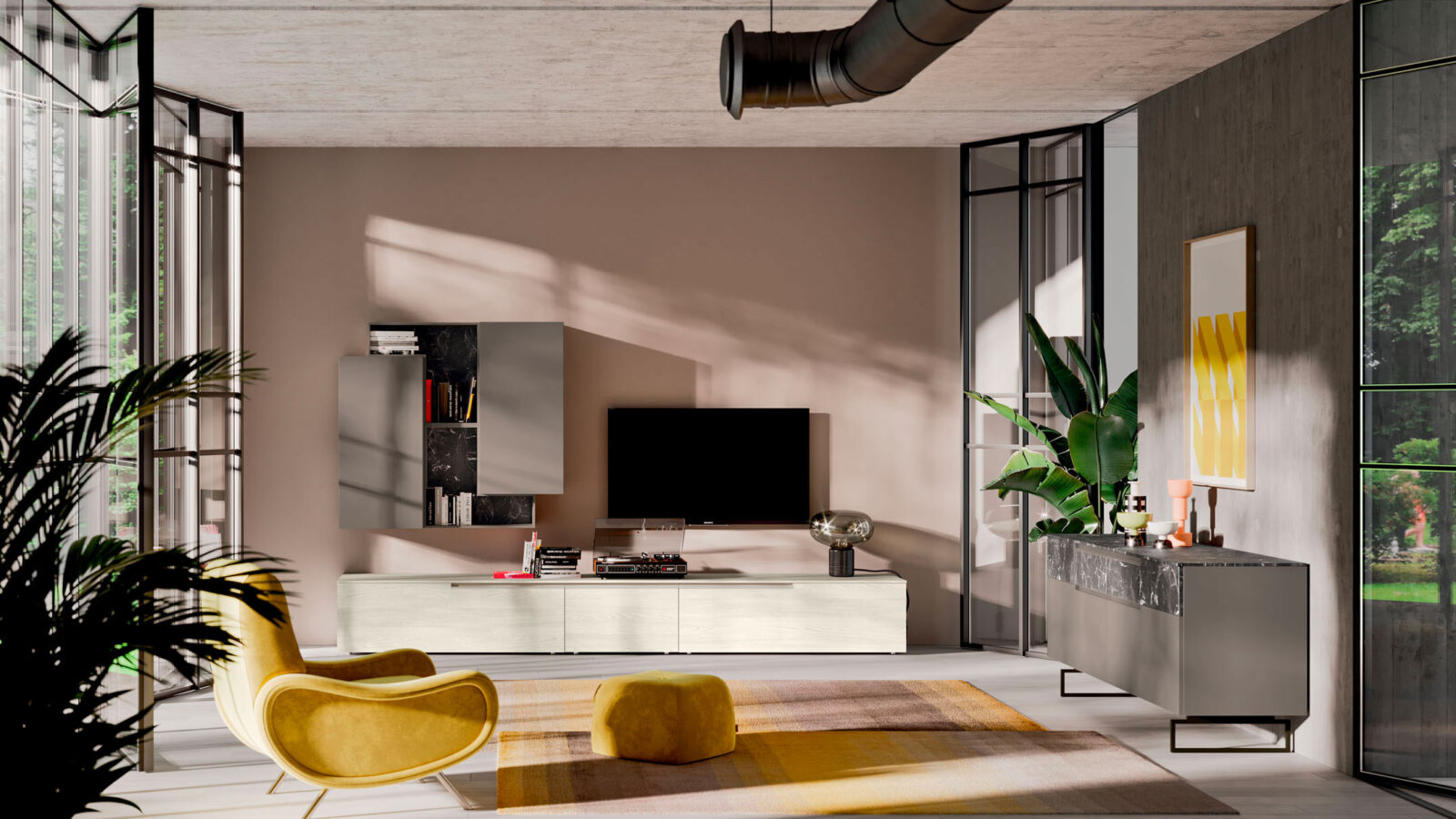 The essential and pure lines of this living room make the environment warm and welcoming, thanks also to the laminat Apollo finish which gives the surfaces materiality.