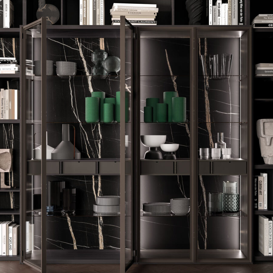 An imposing bookcase that dresses the wall with a texture of voids and solids, embellished with marble finish back panels, glasses and transparencies, plays of light and leather accessories. A sartorial quality that doesn’t leave out the smallest detail to make an extraordinary everyday life.