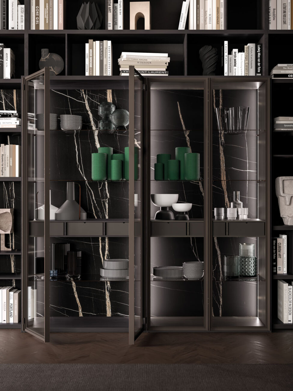 Bookcase in Carbone materic finish with back panels in Tunisi melamine marble finish, bronzed glass doors and shelves, element with Antracite leather drawers.