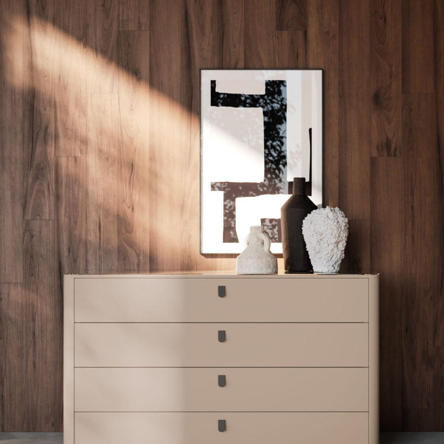 Lovi bedside tables and chest of drawer in Ecrù with burnished handle and top in Amani printed glass.