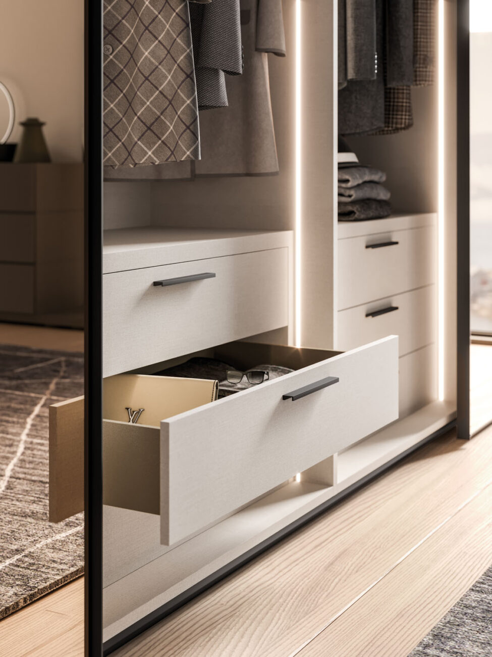 Wardrobes equipped with shelves, hanger tubes, drawer packs with Sigma handle and vertical Led lights.