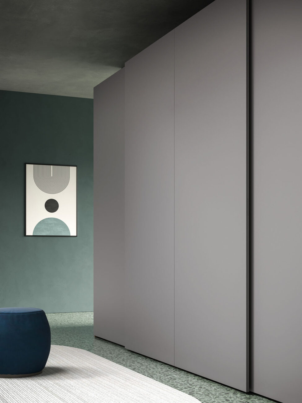 Sliding wardrobe with Liscia door and dedicated handle. Internal structure in Rovere finish, doors and handles in Basalto matt lacquer finish.