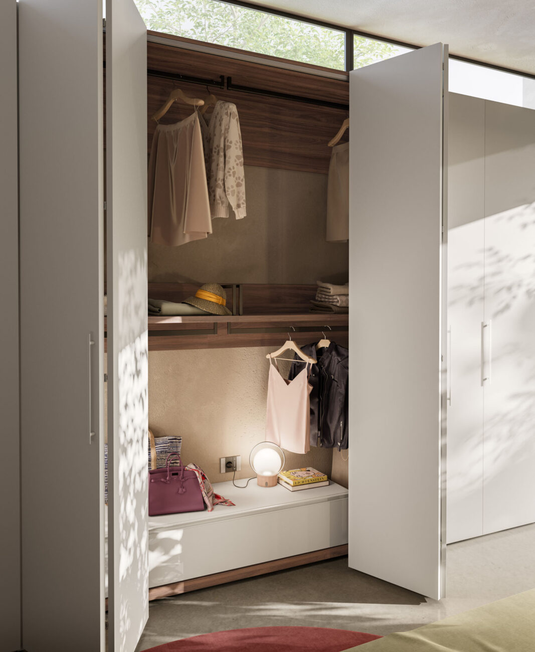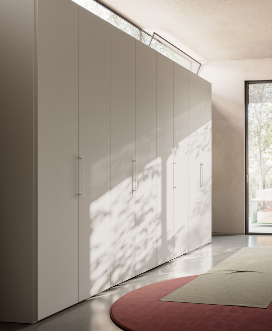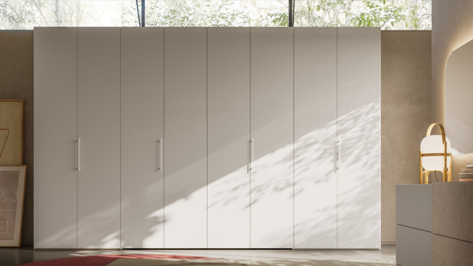 Armadio battente Liscia in Seta con maniglia M 14, cabina Alea in Cotto. Struttura interna in Cotone.