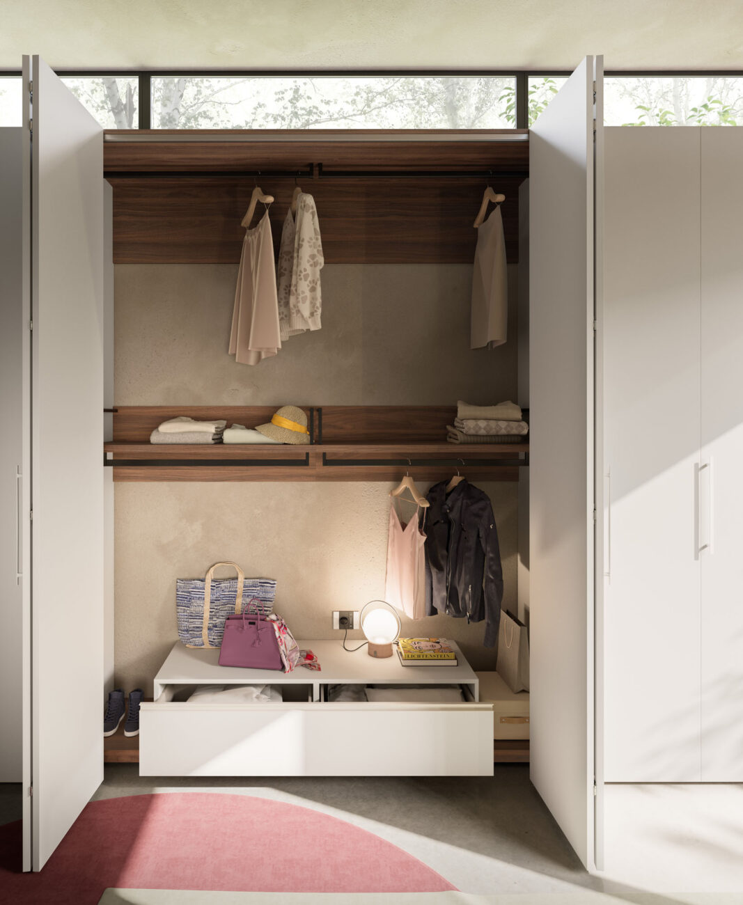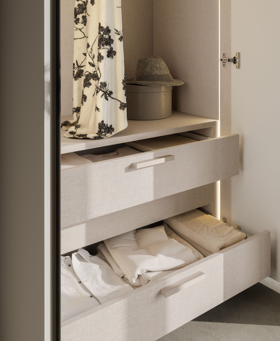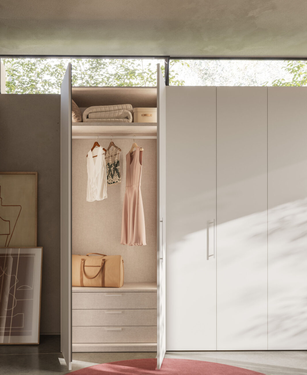 Armadio battente Liscia in Seta con maniglia M 14, cabina Alea in Cotto. Struttura interna in Cotone.