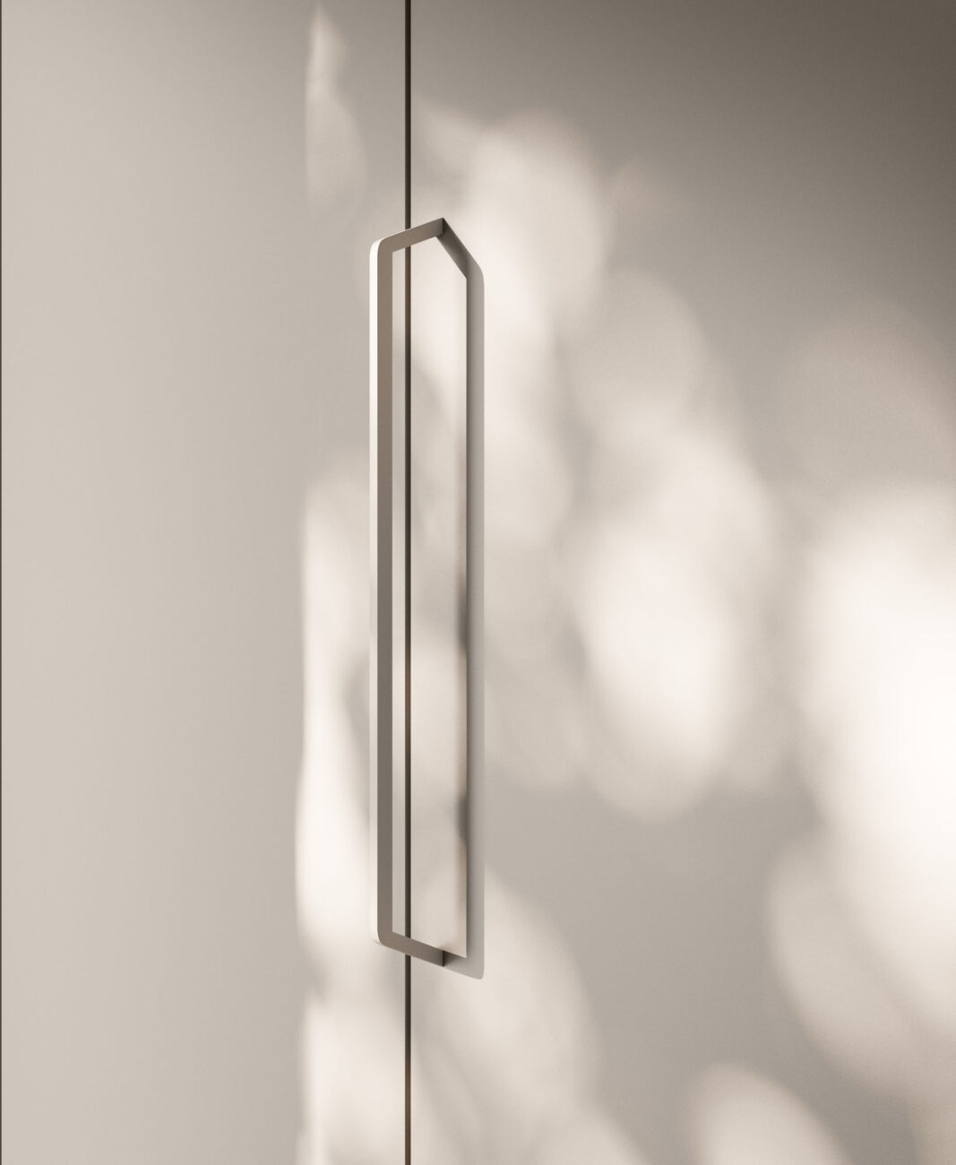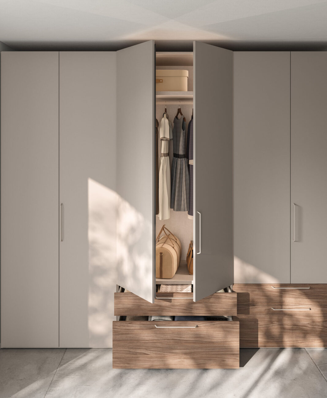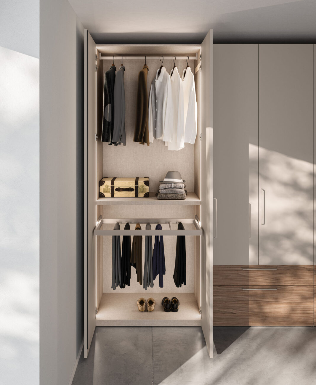Armadio battente Liscia in Tortora e Platino con maniglia M 32 e Ambrogio in Tortora. Struttura interna in Cotone.