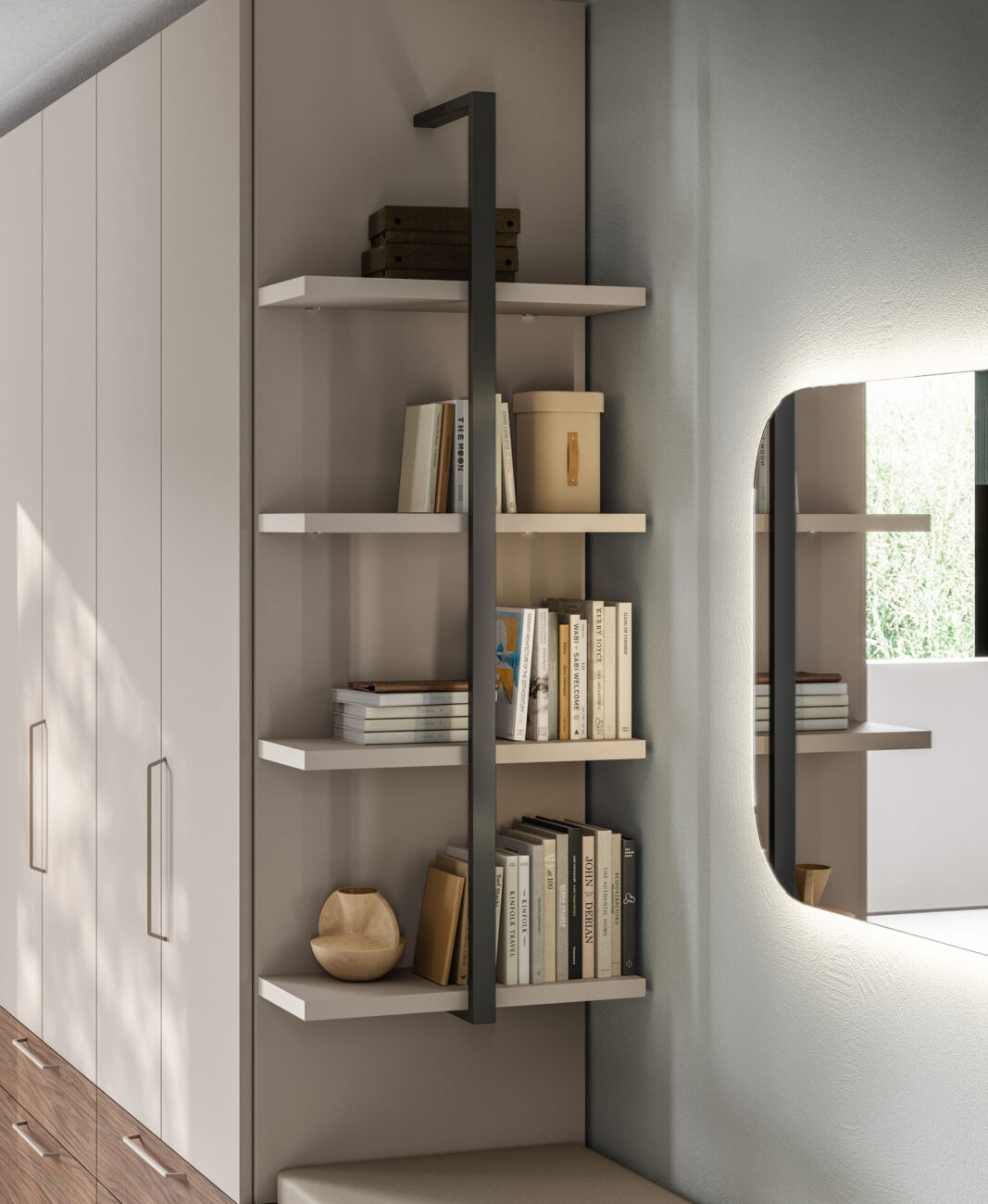 Colonna armadio attrezzata con ripiano, tubo, portapantaloni estraibile e luci LED verticali. Maniglia M 32 in Tortora.