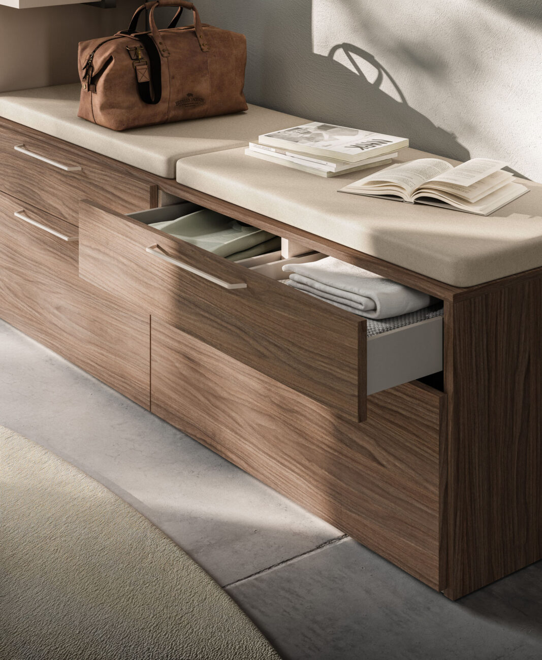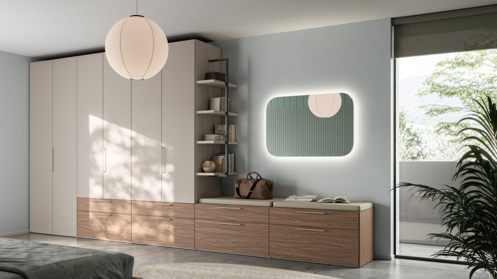 Armadio battente Liscia in Tortora e Noce, maniglia M 32 in Tortora. Basi terminali in Noce con maniglia M 32 in Tortora, cuscini imbottiti in Ecopelle S241.
