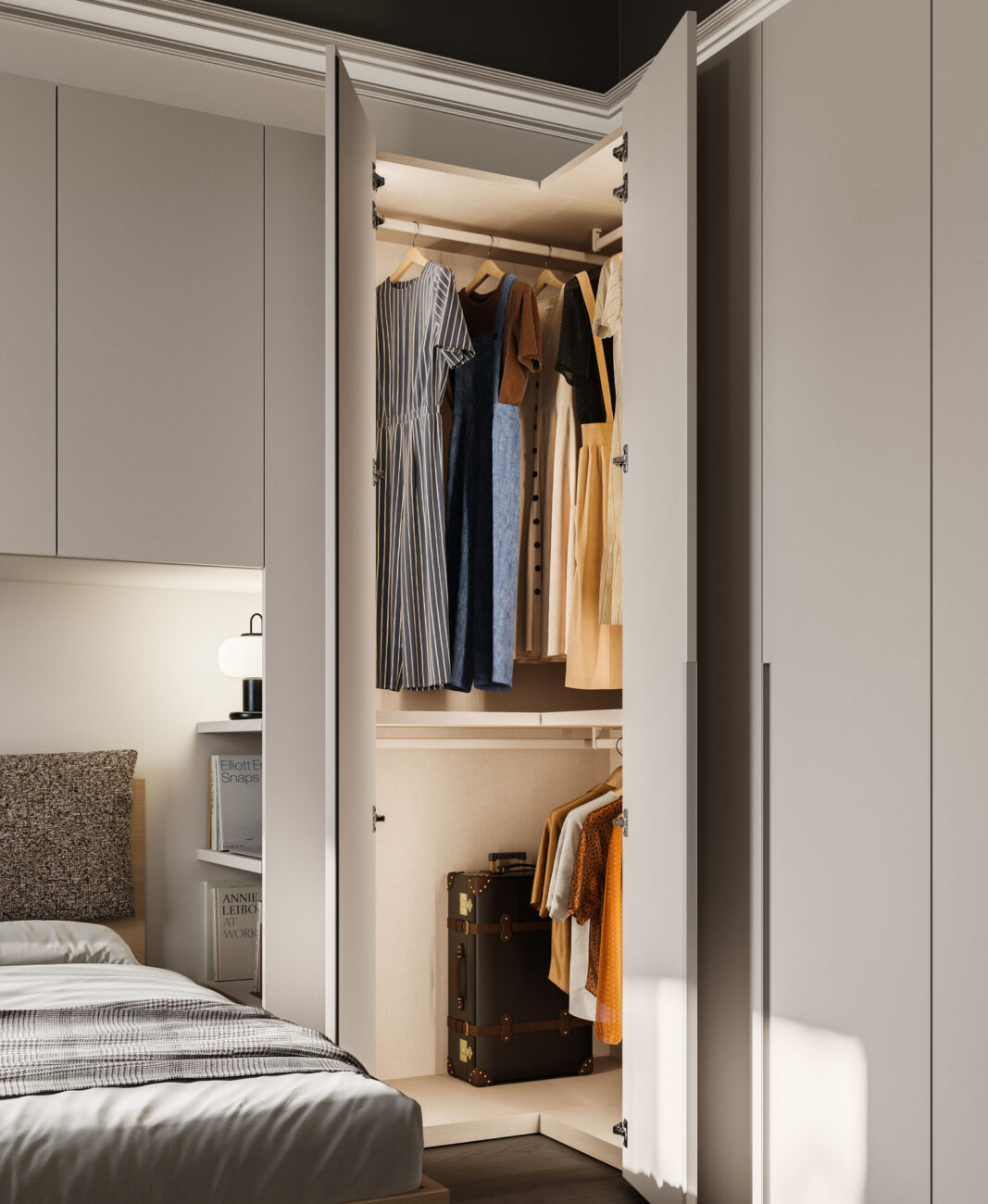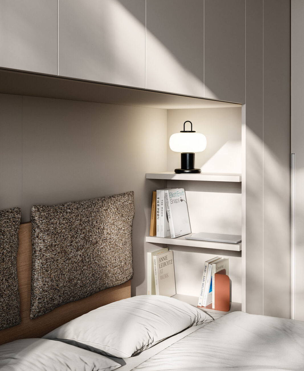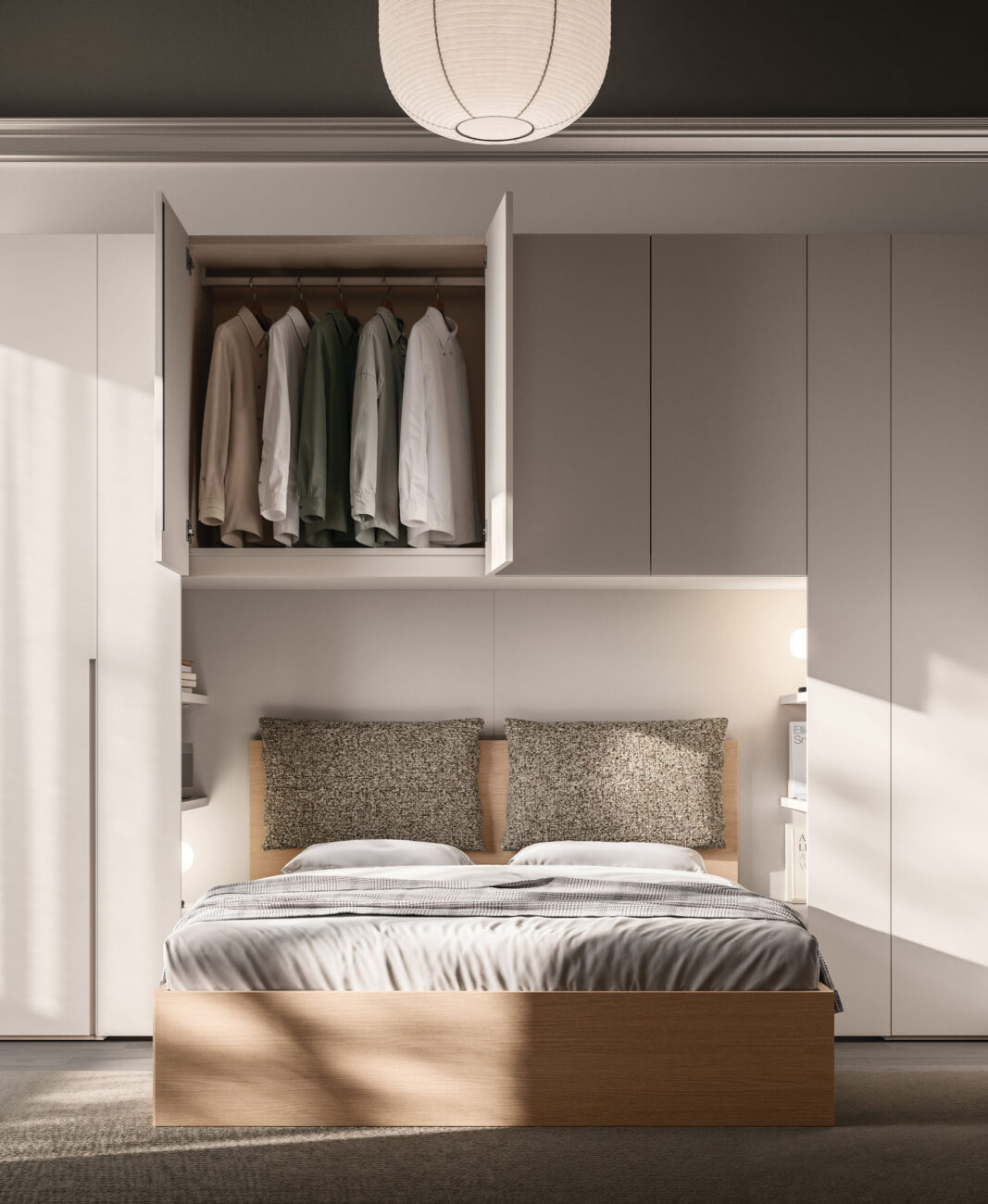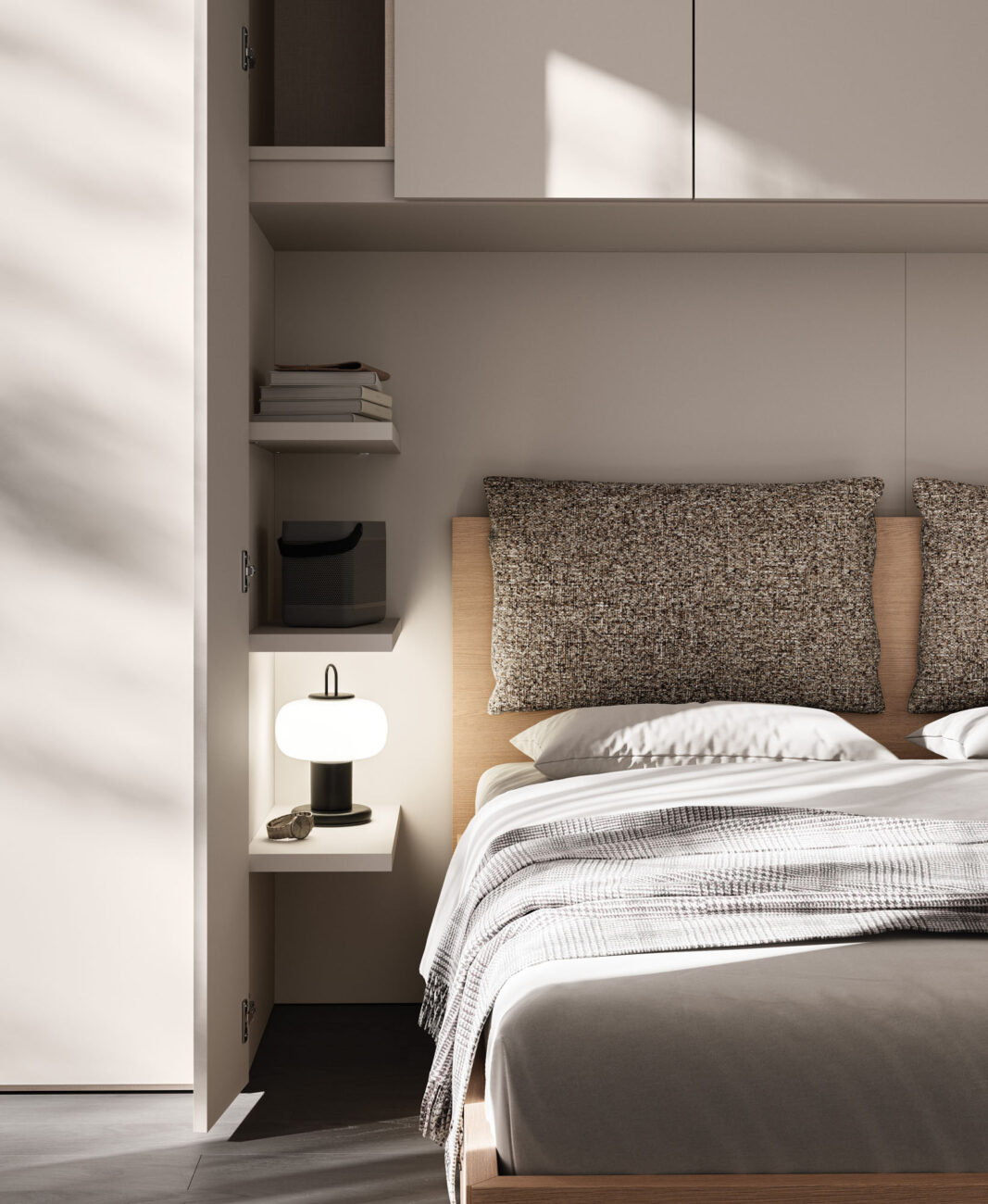 Letto Cremi in Arena con cuscini in tessuto Clara CL03. Modulo ponte libreria e armadio battente Tratto 1200 in Velluto, maniglia dedicata in tinta.